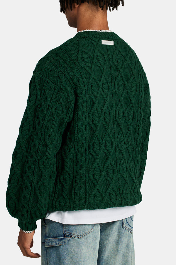 Cable Knit Varsity Sweater - Forest Green