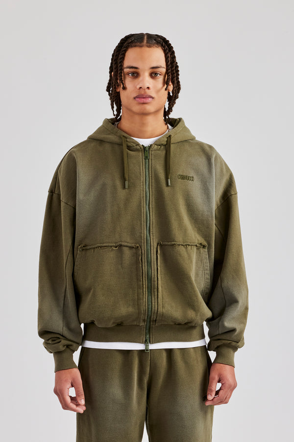 Washed Applique Boxy Zip Through Hoodie - Acid Wash
