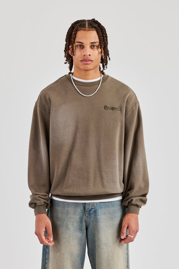 Washed Applique Zip Through Hoodie - Brown