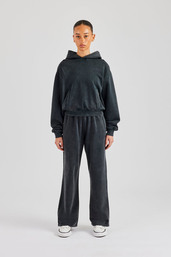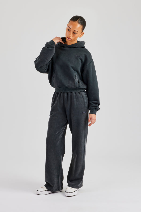 Womens Washed Boxy Fit Zip Through Hoodie & Wide Leg Jogger - Black