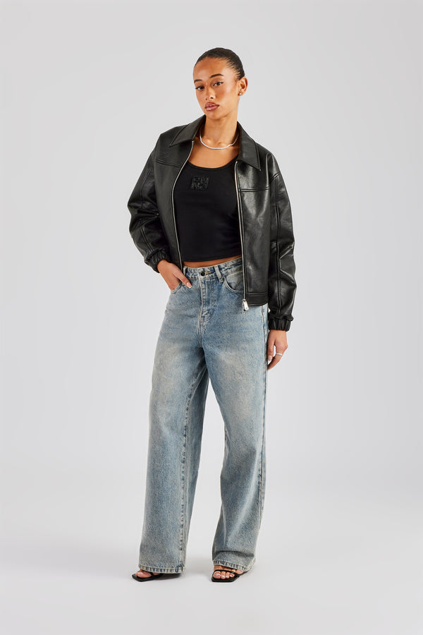Cropped Curved Hem Denim Jacket & Low Rise Jeans - Washed Black