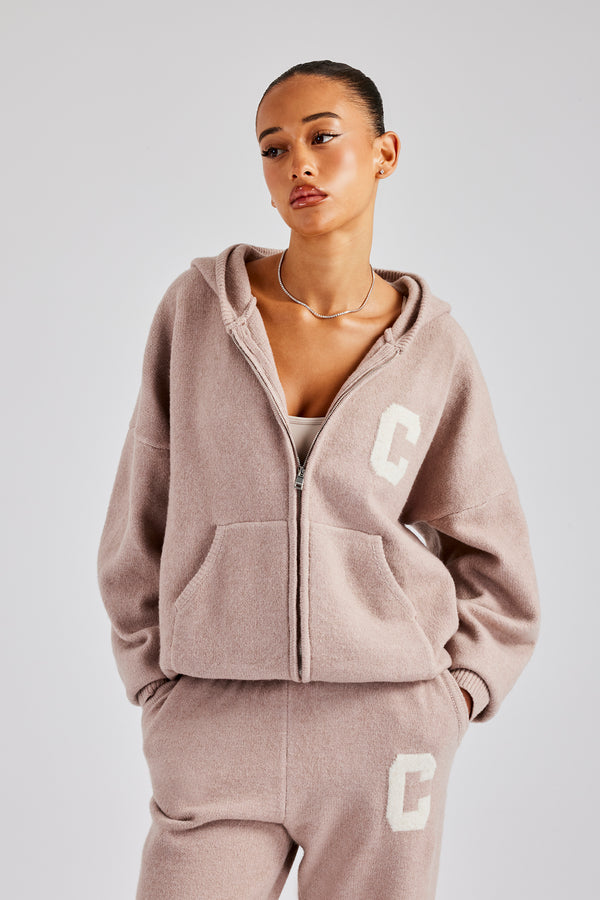 Knitted Cernucci Back Detail Zip Hoodie - Brown