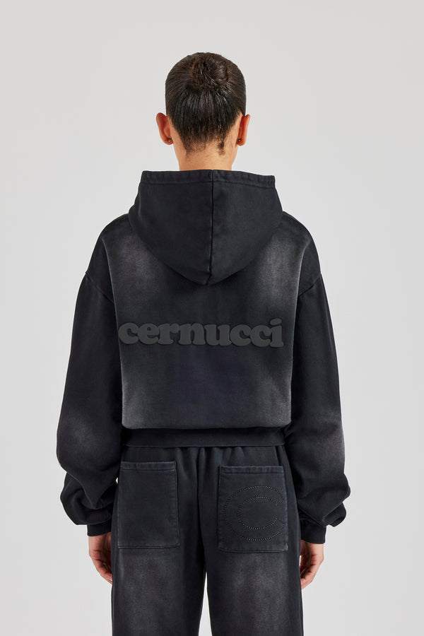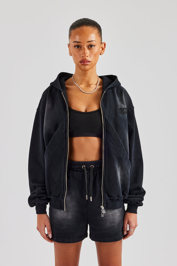 Womens Washed Boxy Fit Zip Through Hoodie - Black
