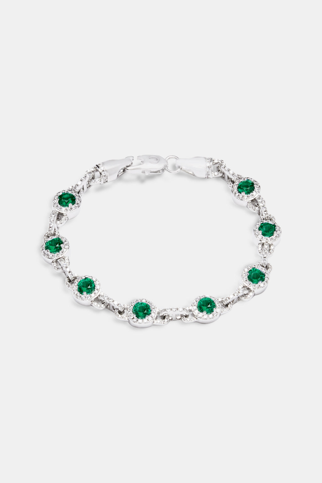 Iced Out -Gliederarmband mit grünen Mittelsteinen für einen unvergleichlichen Glanz. Werten Sie Ihre Passform mit dem perfekten Stück auf.