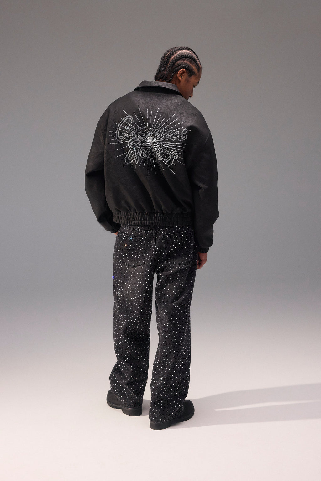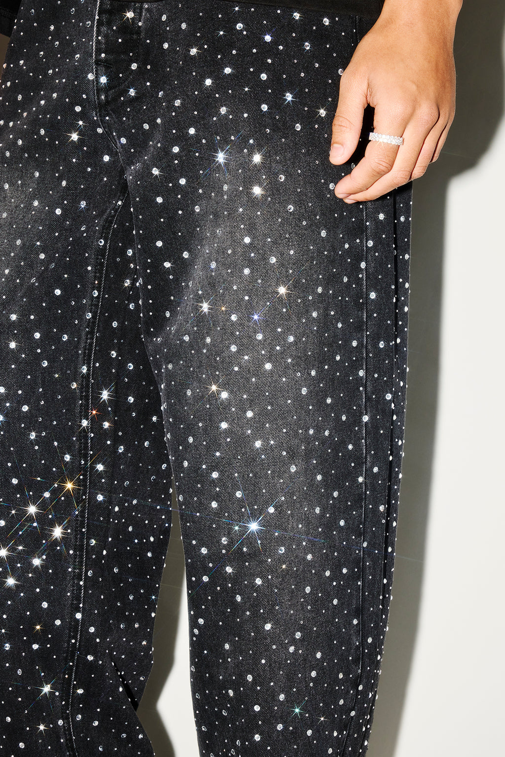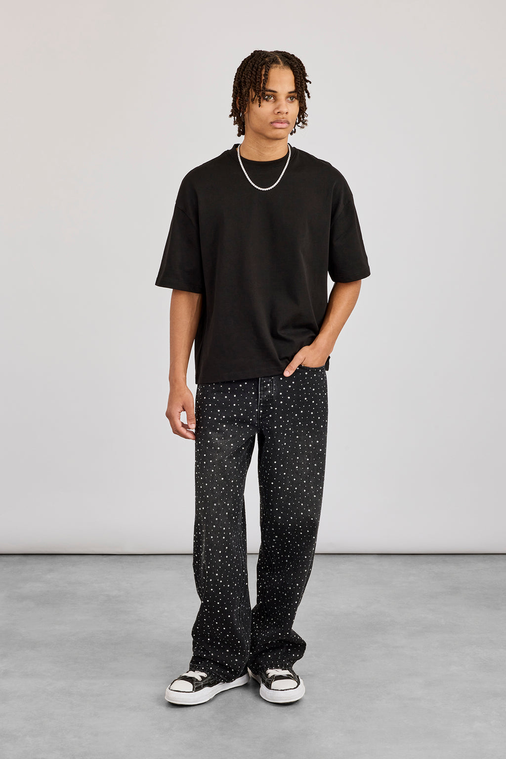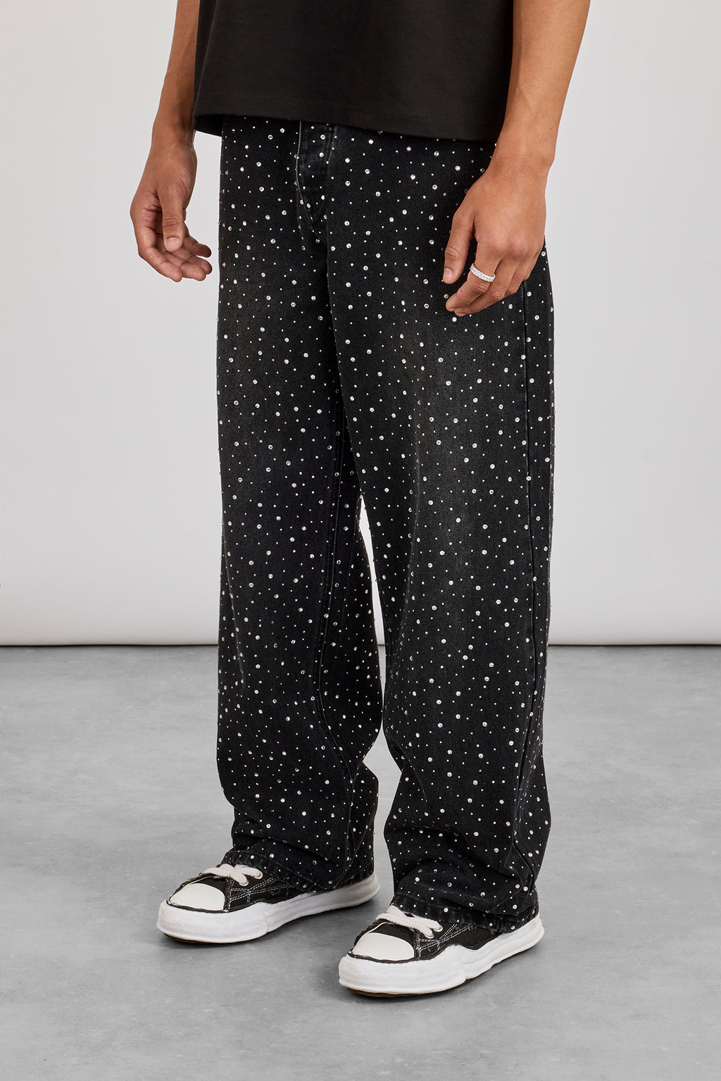 All over rhinestones jeans in our washed black. Baggy fit in cotton rigid denim finished with branded trims.