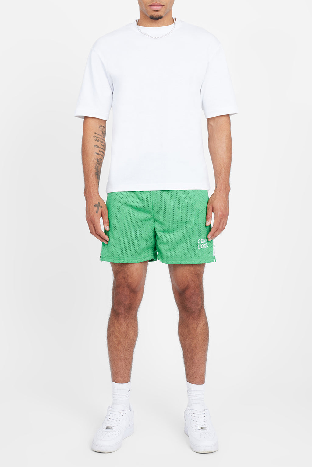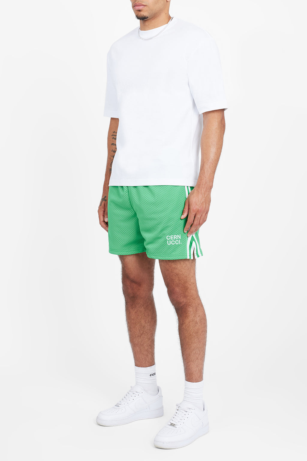 Grüne Shorts mit besticktem Cernucci-Band aus leichtem Netzstoff.