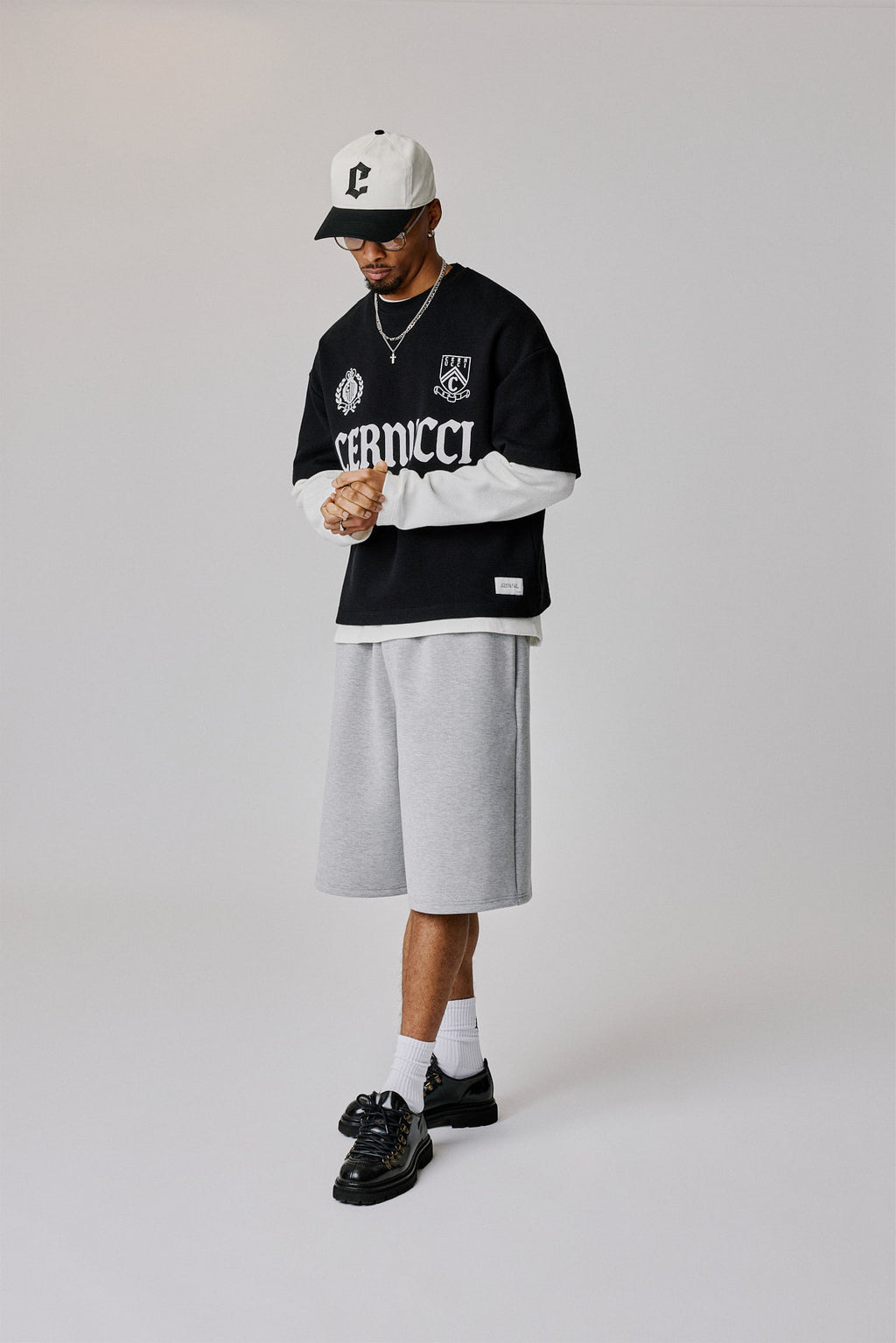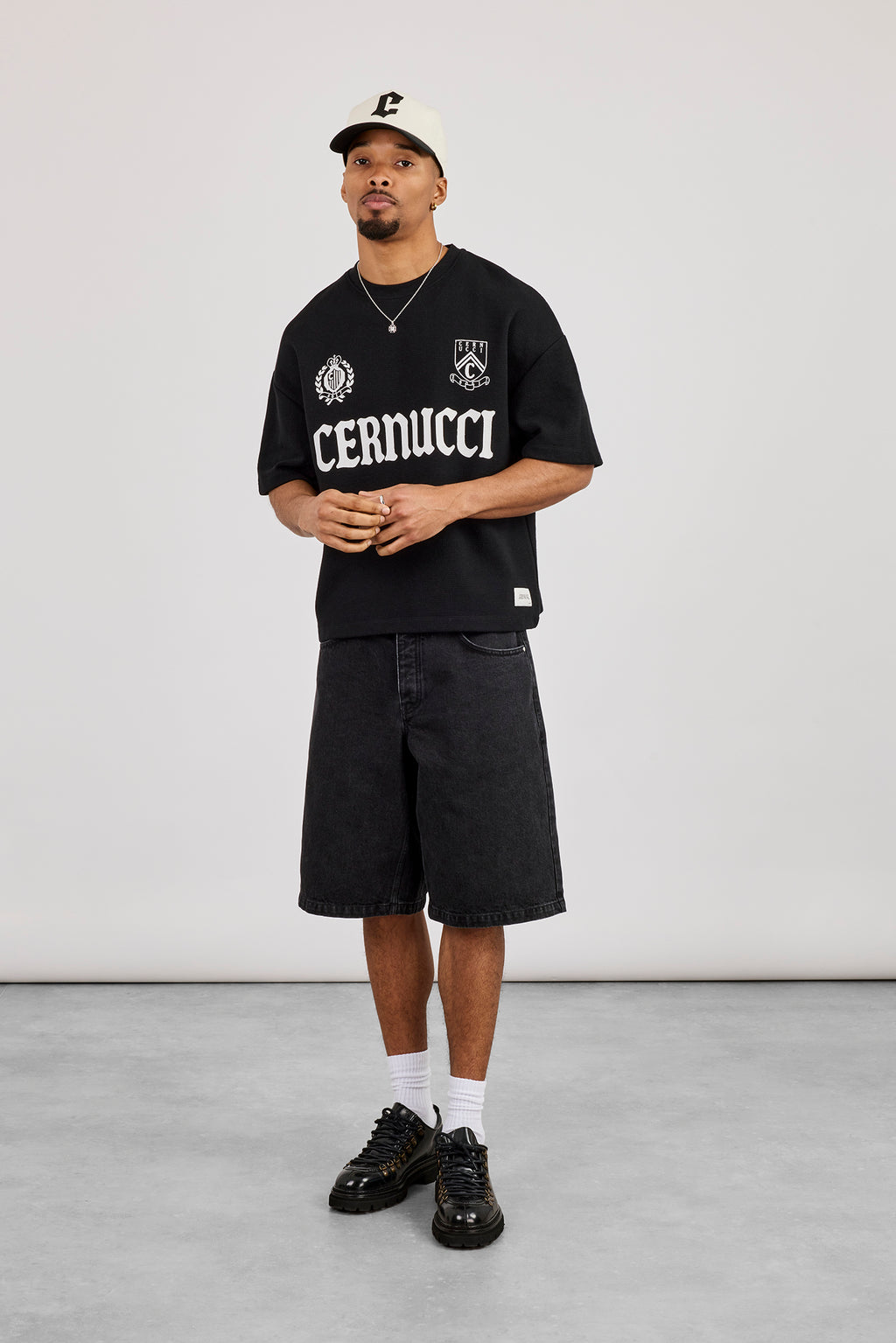 Kurzärmeliges Waffel-T-Shirt mit Cernucci-Print auf der Vorderseite. Kastenförmiger Schnitt, überschnittene Schultern, aus weichem Premium-Jersey.