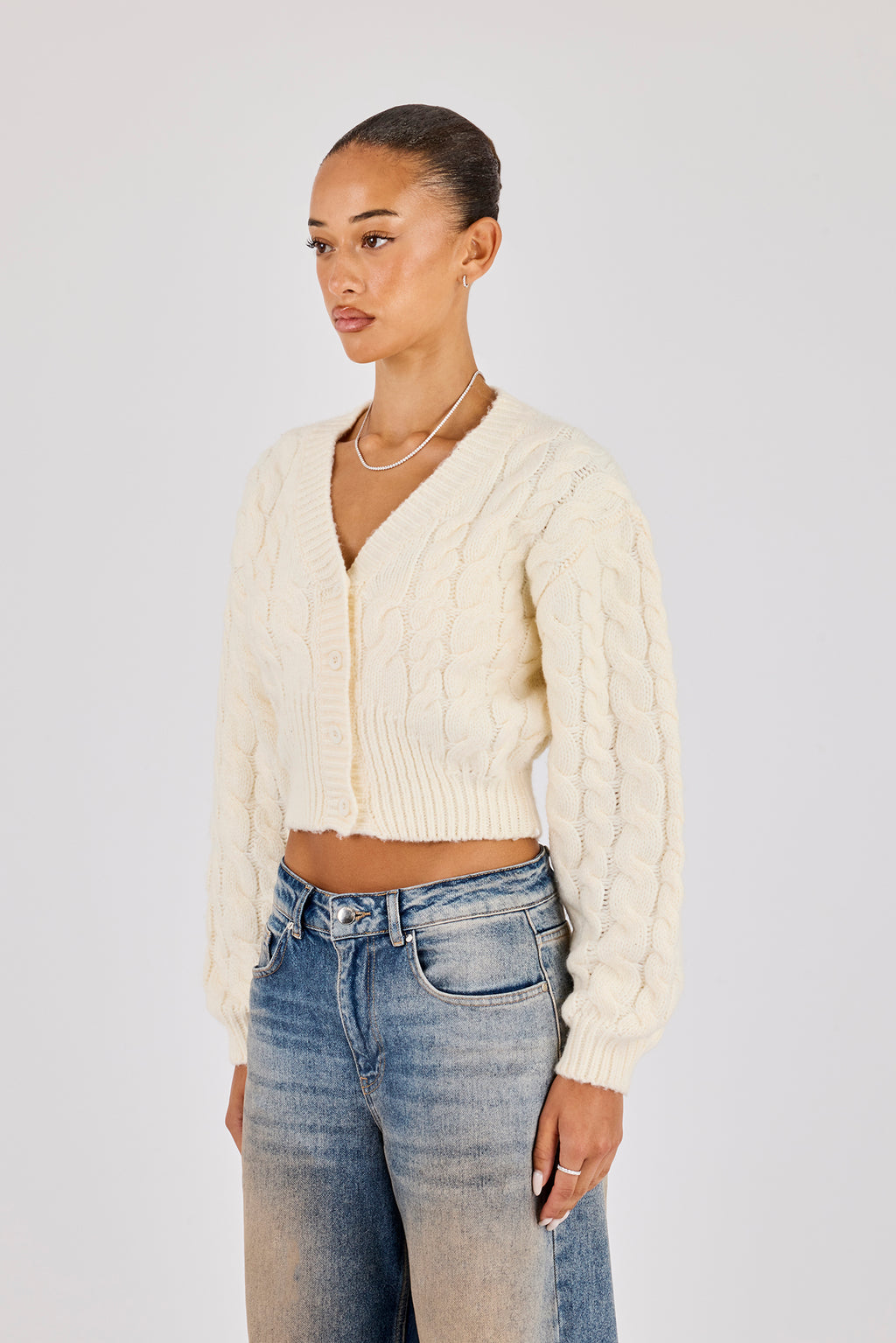 Haferflockenfarbene Strickjacke mit Zopfmuster in weichem Strick mit Zopfmuster