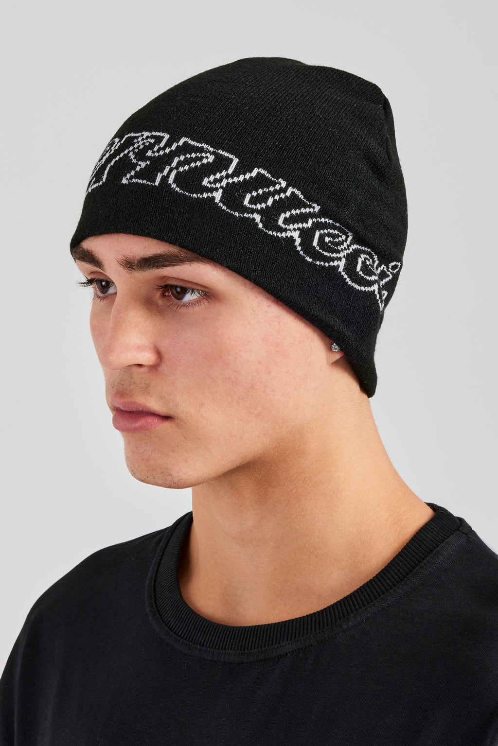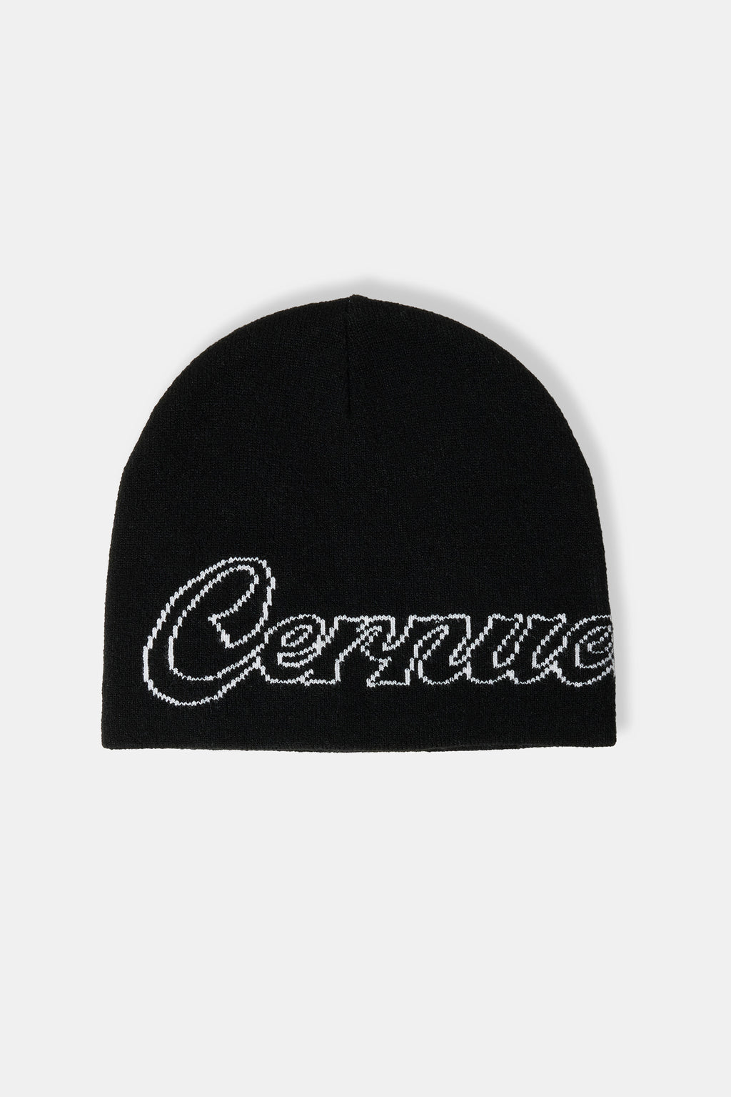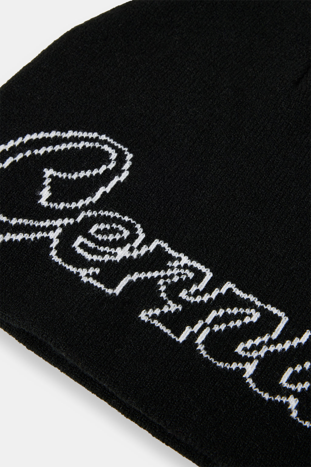 Schwarze Cernucci-Mütze aus weichem Garn mit kontrastierendem Intarsien-Branding. Der perfekte Winterwärmer.