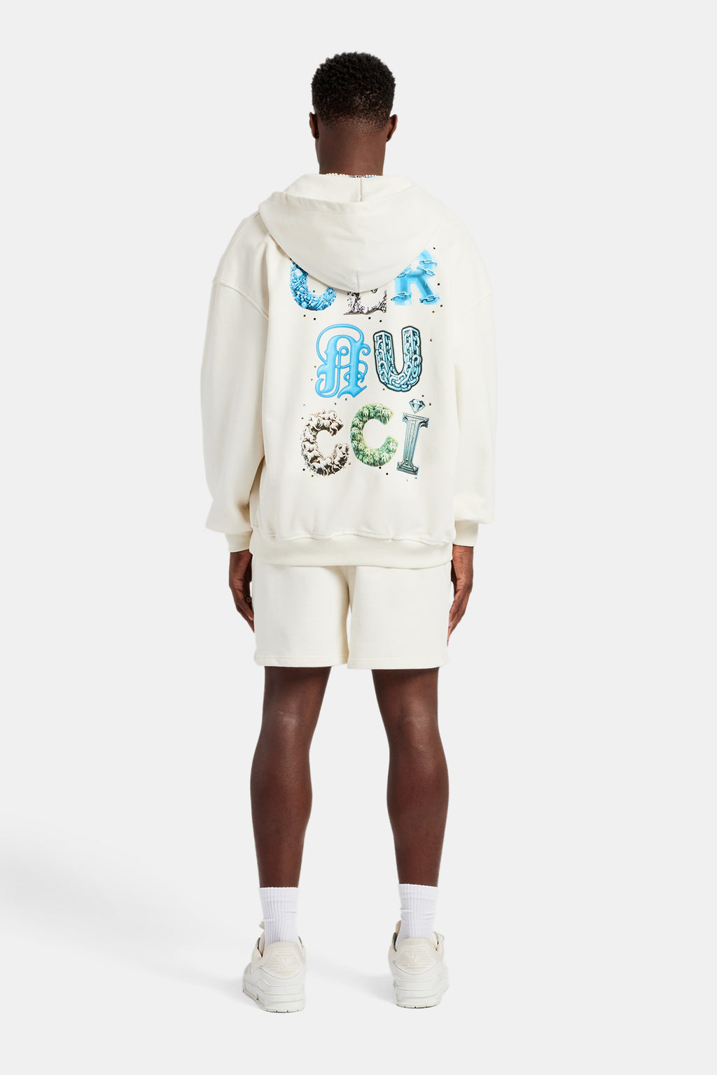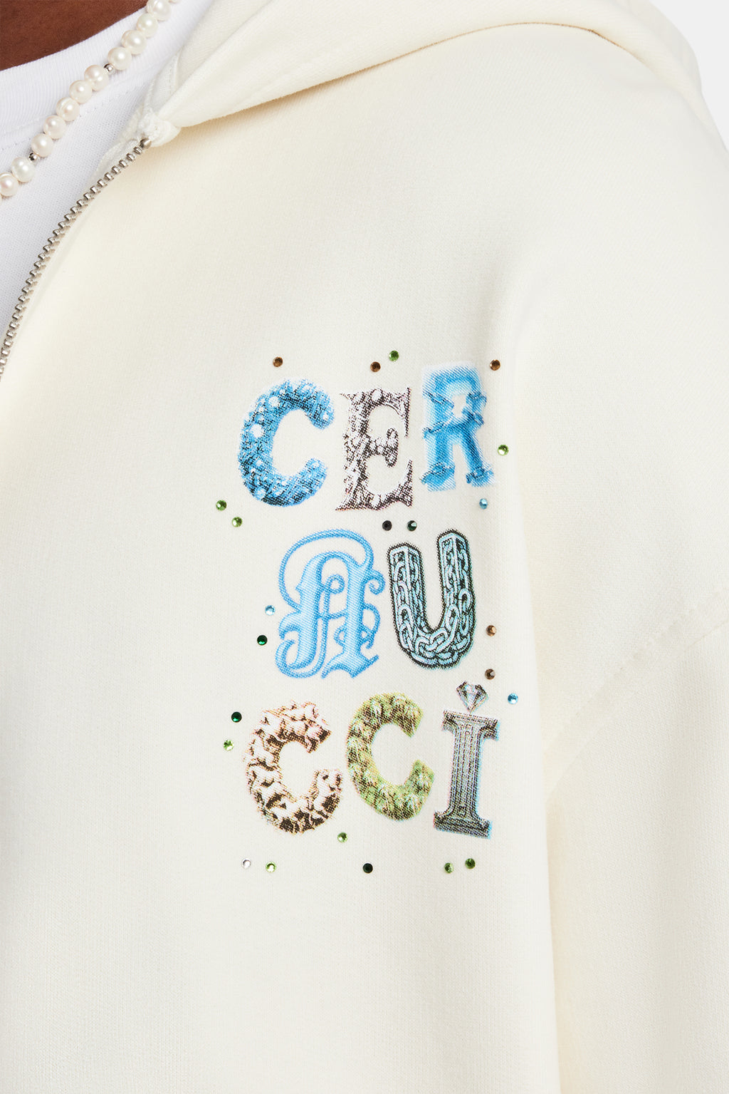 Kapuzenpullover mit durchgehendem Reißverschluss und Strassbuchstaben von Cernucci. Übergroße Passform aus schwerer, weicher Baumwolle.