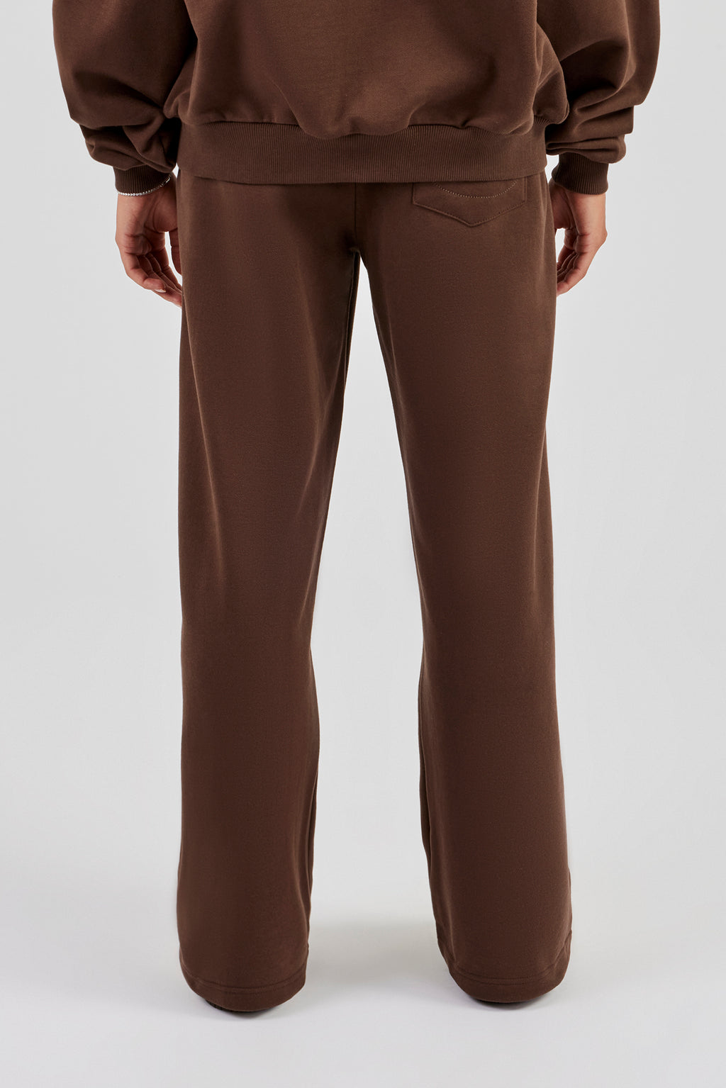 Schokoladenbraune Jogginghose mit weitem Bein. Hochwertiges, weiches Jersey mit PU-Aufnäher der Marke Cernucci auf dem hinteren Bund in der Mitte.