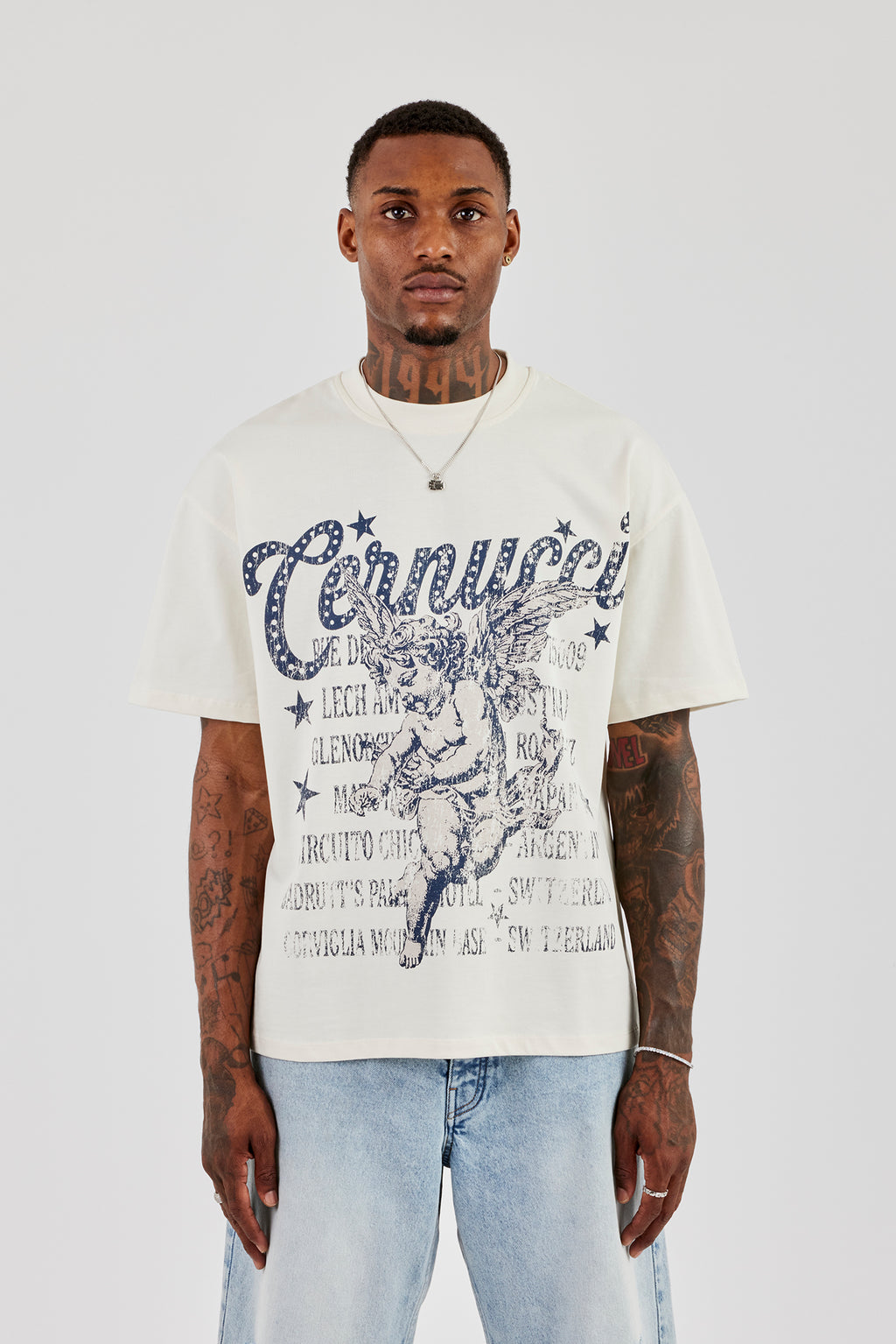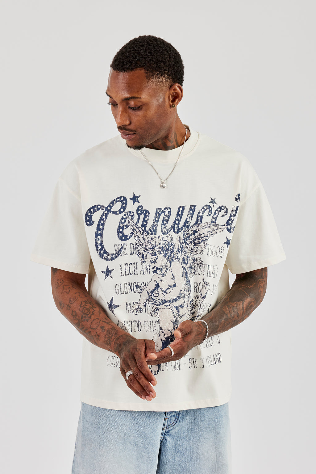 Cremefarbenes Kurzarm-T-Shirt mit Grafik auf der Vorderseite. Übergroße Passform, überschnittene Schultern aus weichem Premium-Jersey.