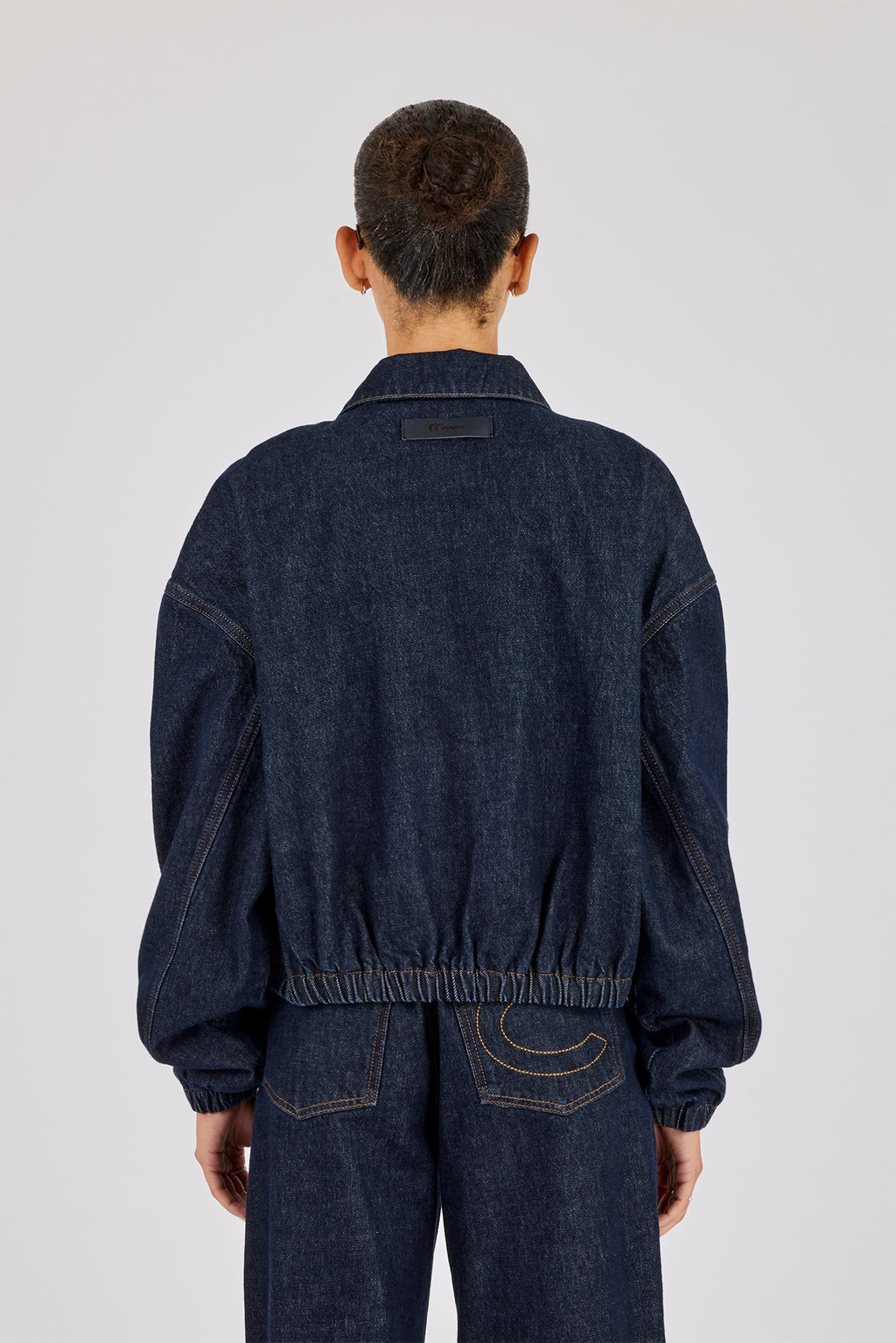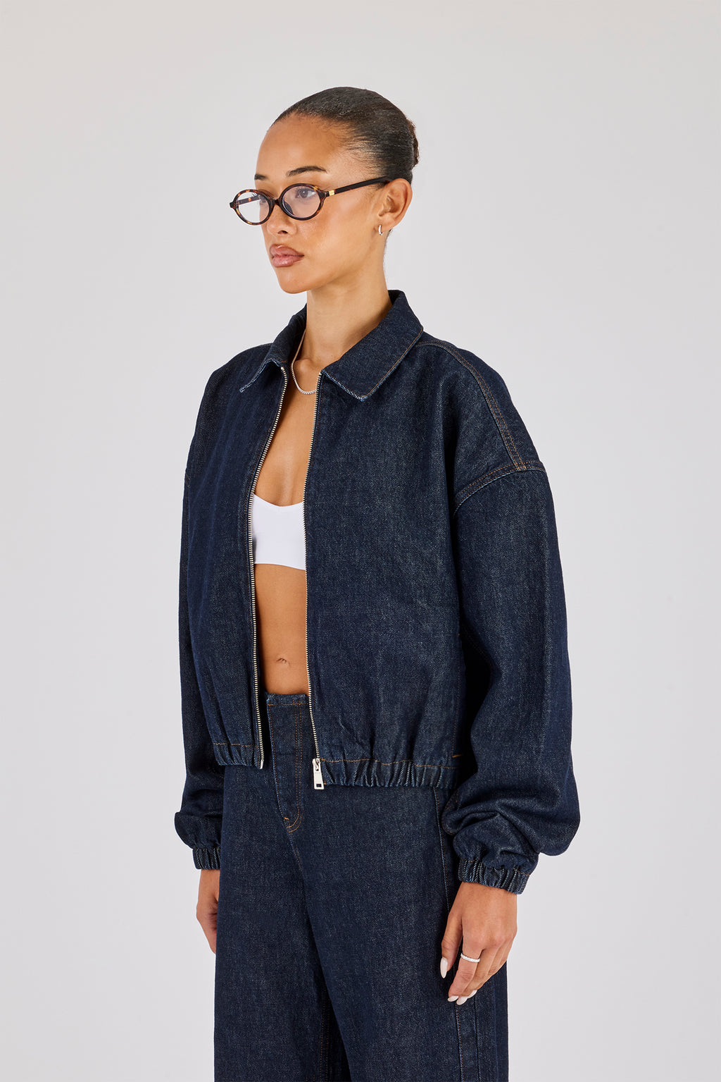Indigo denim zip through collared bomber jacket. In our premium rigid cotton denim.