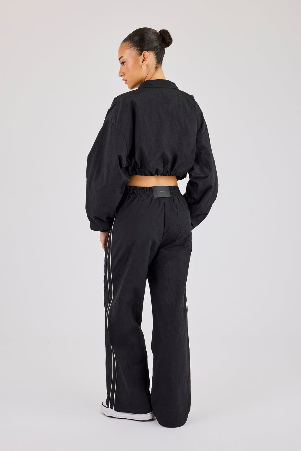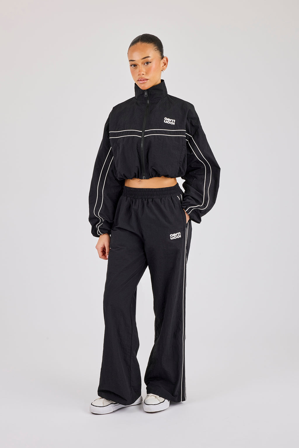 Schwarze, kurze Trainingsjacke aus knitterfreiem Nylon mit kontrastierenden Paspeln und Markenlogo. Passend dazu unsere Jogginghose.