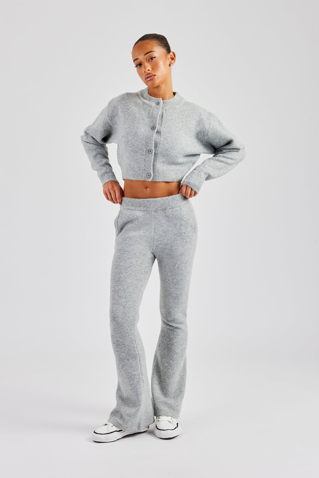 Graue, kurze Strickjacke mit Knopfleiste aus weichem Strickmaterial und Ton-in-Ton-Stickerei mit Cernucci-Logo.