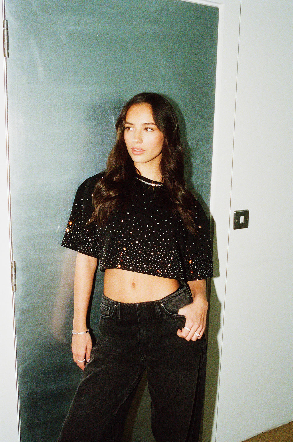 Unser kurzes T-Shirt mit Strasssteinen. Hergestellt aus weichem Premium-Jersey.