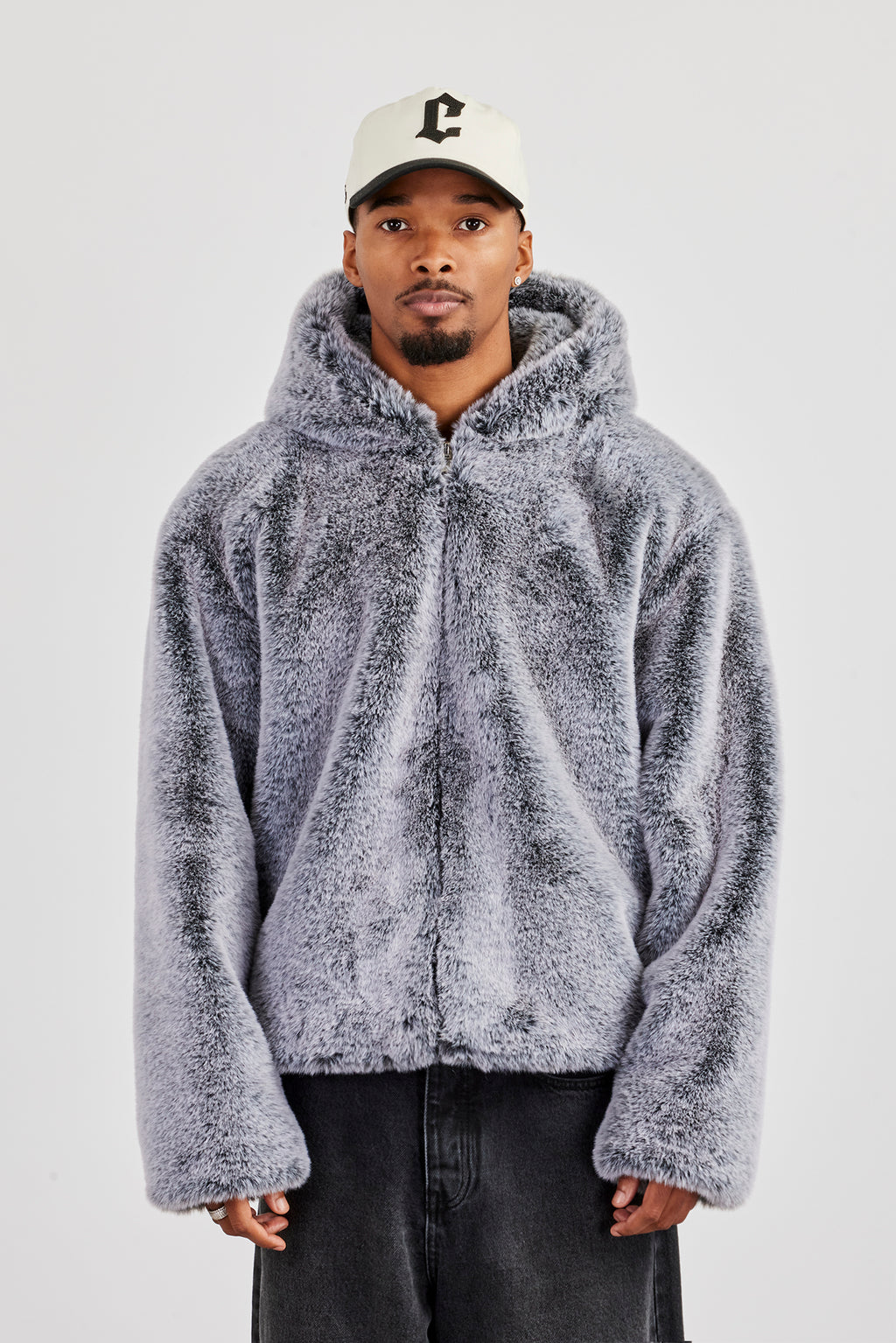 Graue Pelzjacke mit Kapuze in Oversize-Passform.