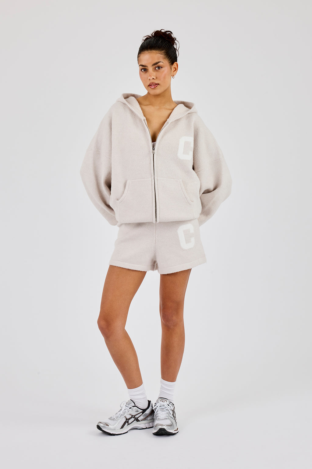 Unsere C-Strickshorts aus weichem, strukturiertem Strickmaterial. Kombinieren Sie sie mit dem passenden Strickhoodie mit Reißverschluss für den perfekten Look.