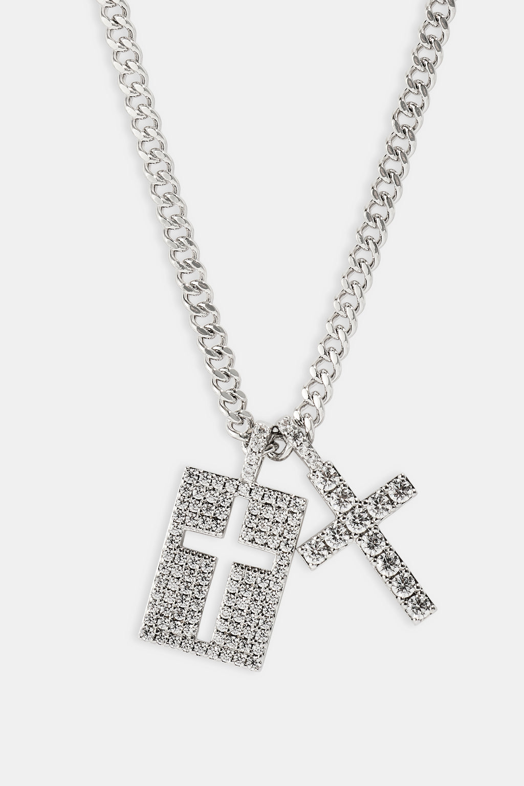 Our Iced Double Cross & Outline Necklace goes hard. Perfect to stack with a tennis chain. Shine correct.