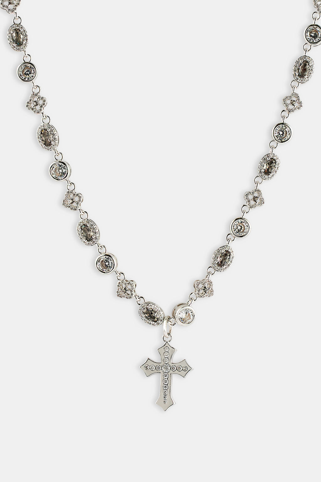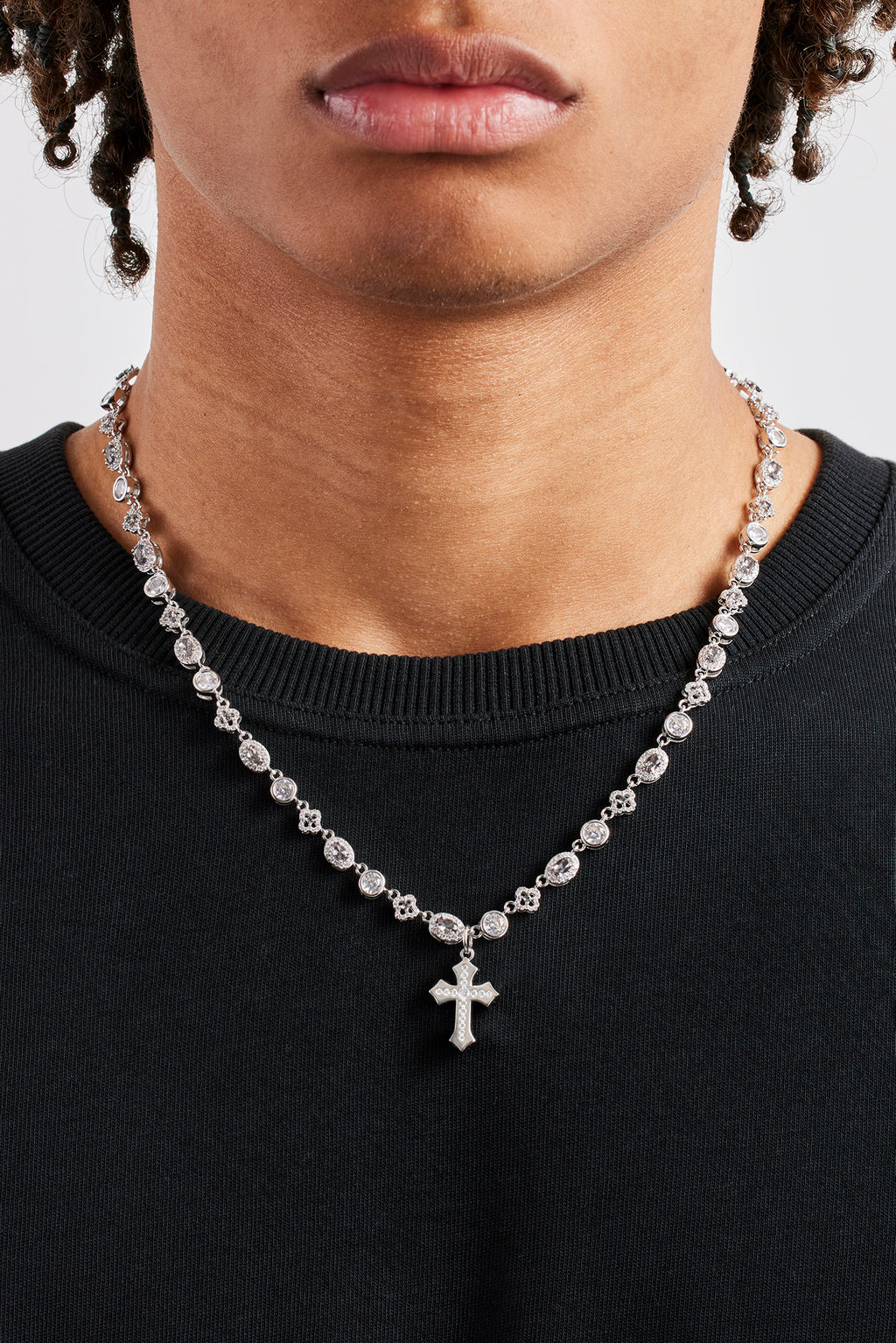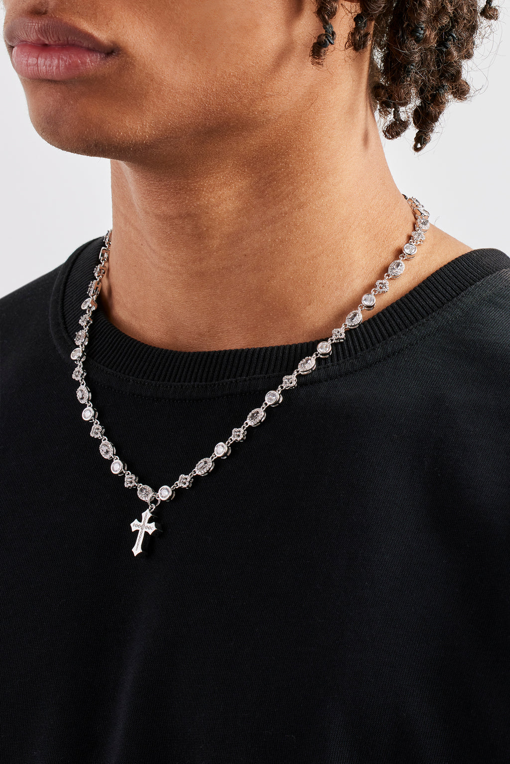 Diese Kette mit eisverziertem Tropfenkreuz und Motiv aus mehreren Edelsteinen ist ein echter Hingucker. Kombinieren Sie sie mit einem schlichten Armband oder Ring und Sie werden alle Blicke auf sich ziehen.