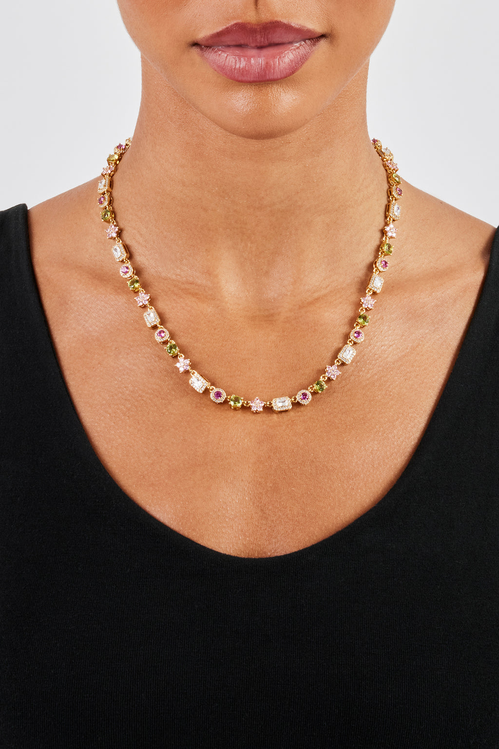 Diese Kette kombiniert bunte Edelsteine mit floral inspirierten Gliedern für einen frischen, auffälligen Look. Sie ist die perfekte Mischung aus verspielt und elegant.