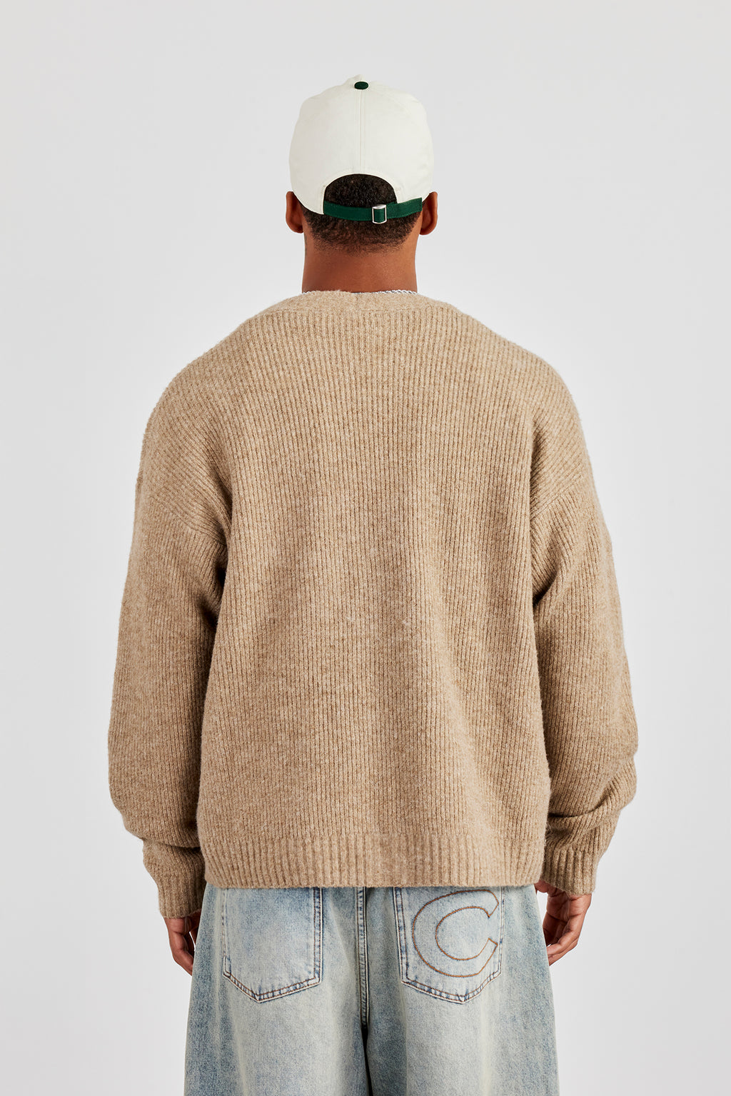 Taupefarbene Strickjacke mit kastiger Passform und weichem Griff.