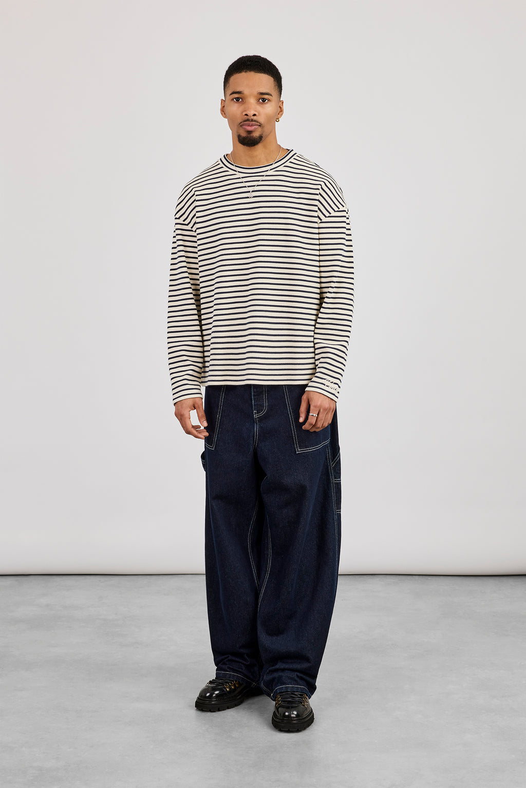 Langärmeliges gestreiftes Waffel-T-Shirt mit Cernucci-Stickerei am Ärmel. Entspannte Passform, überschnittene Schultern aus weichem Premium-Jersey.
