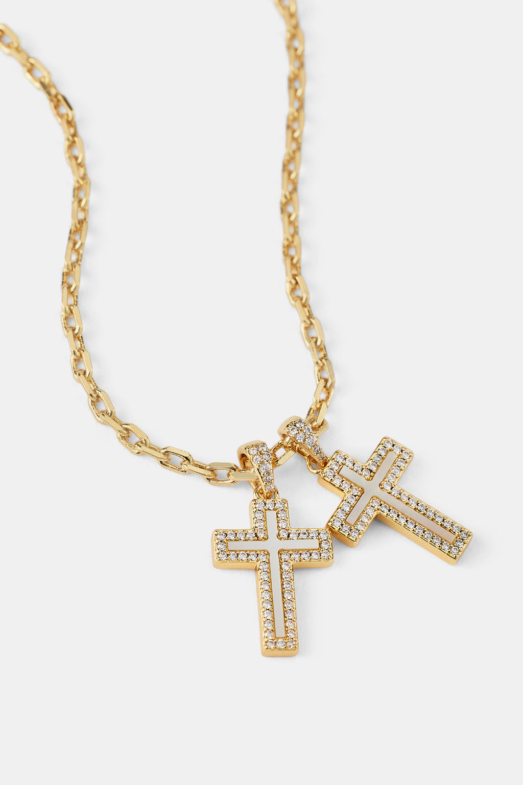 Die Perlmutt-Doppelkreuz-Halskette vereint eine glatte, schimmernde Oberfläche mit einem klaren Kreuzdesign. Ein dezentes und dennoch ausdrucksstarkes Schmuckstück, das jedem Look eine elegante Note verleiht.