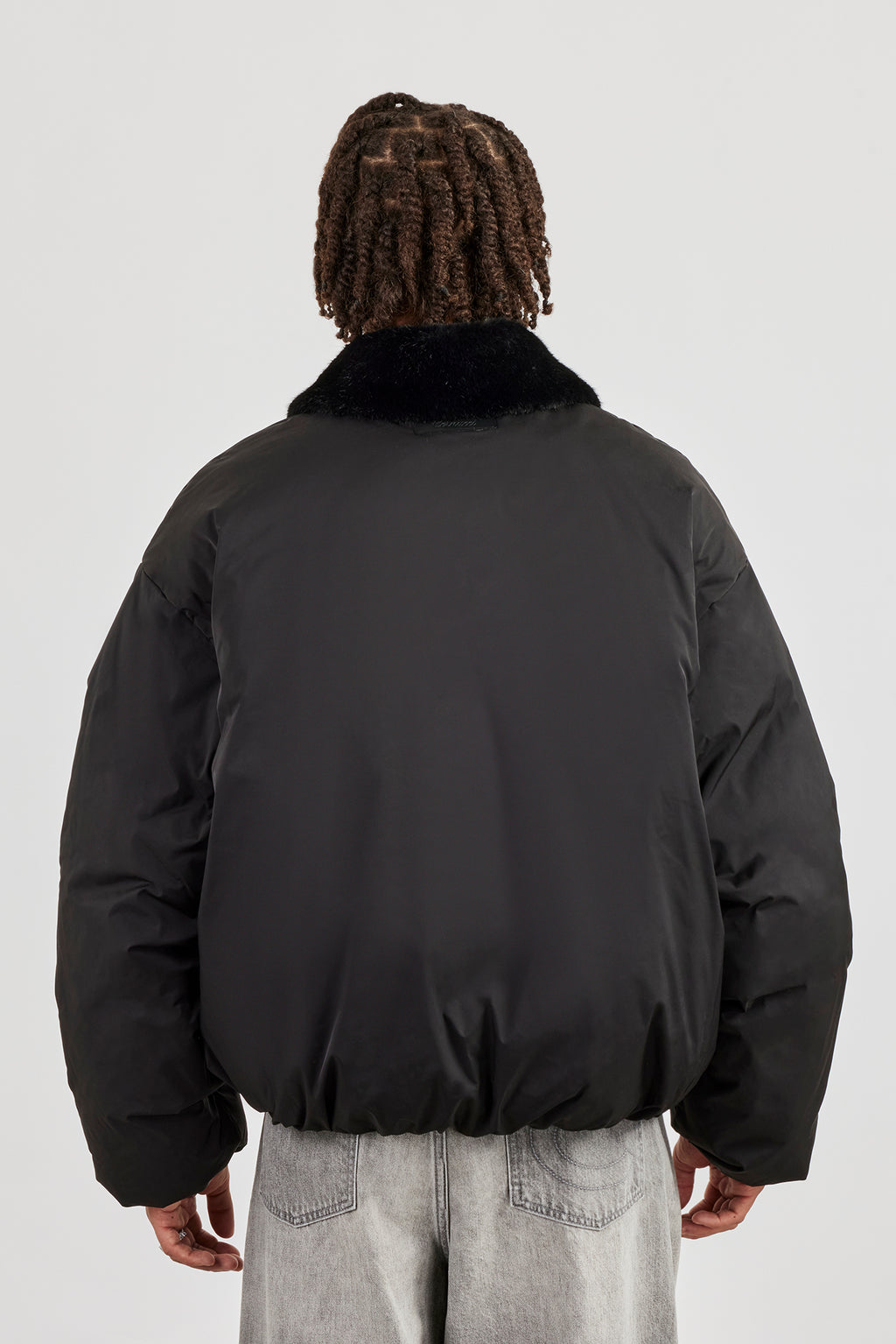 Schwarze wattierte Bomberjacke mit Pelzkragen.