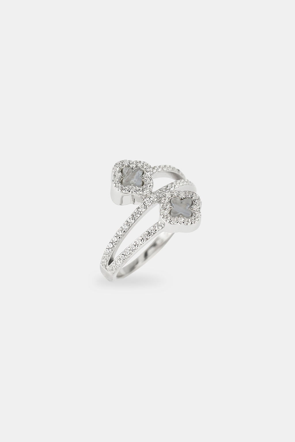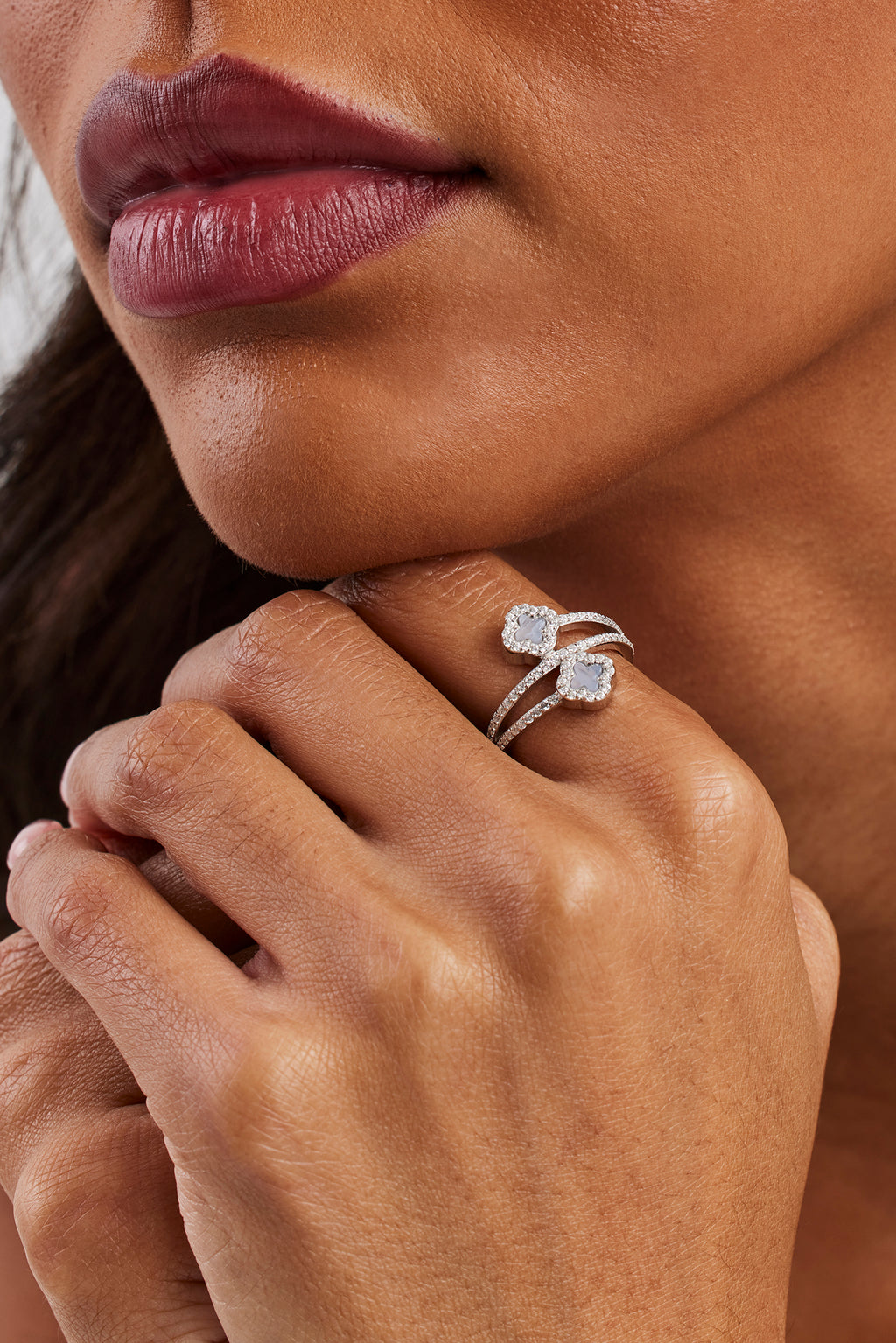 Der Twist-Ring mit violettem Achatmotiv zeigt ein reiches, wirbelndes violettes Achatmotiv, das in ein glattes, geformtes Band eingewickelt ist, bei dem es um organische Ausstrahlung mit modernem Touch geht.