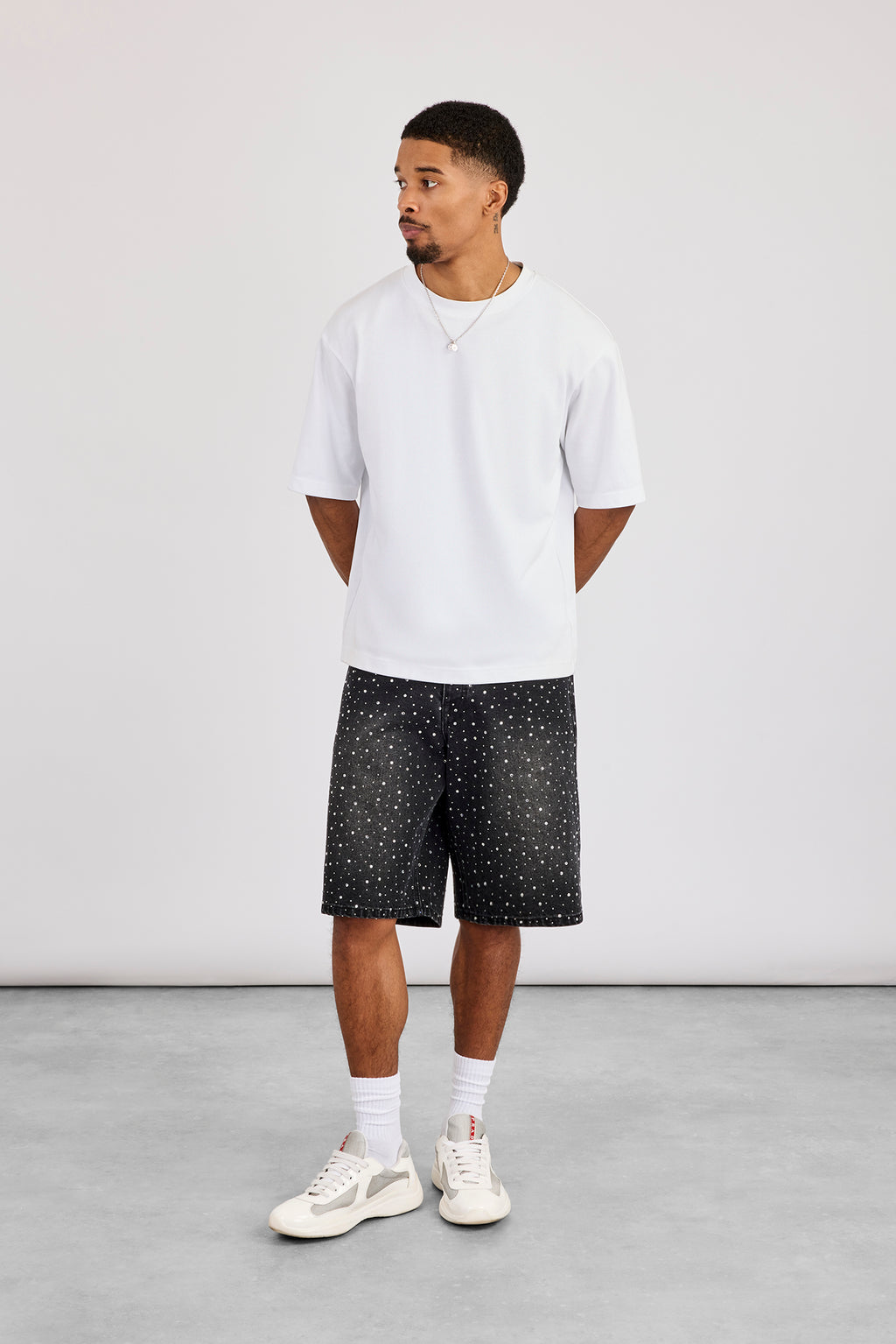 Jeansshorts mit Strassbesatz in verwaschenem Schwarz. Robuster Baumwoll-Denim mit Markendetails.
