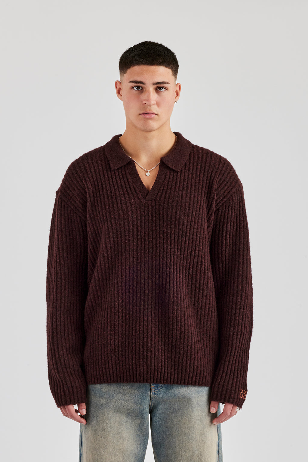 Schokoladenbraunes Stricksweatshirt mit Kragen und V-Ausschnitt, lockere Passform aus weichem Strick.