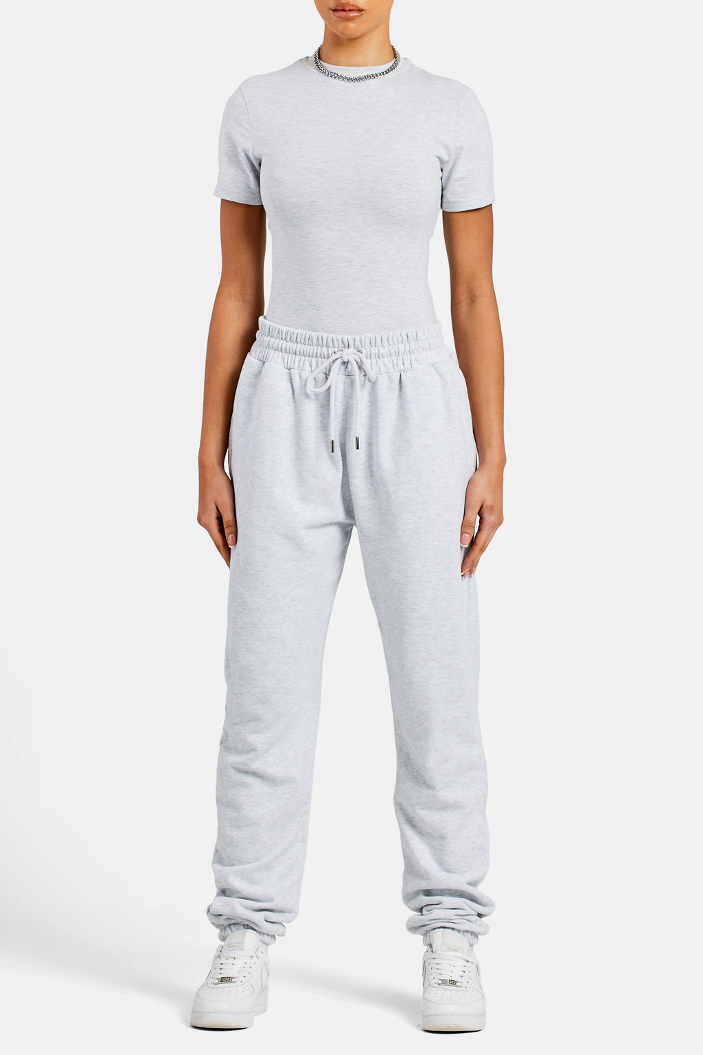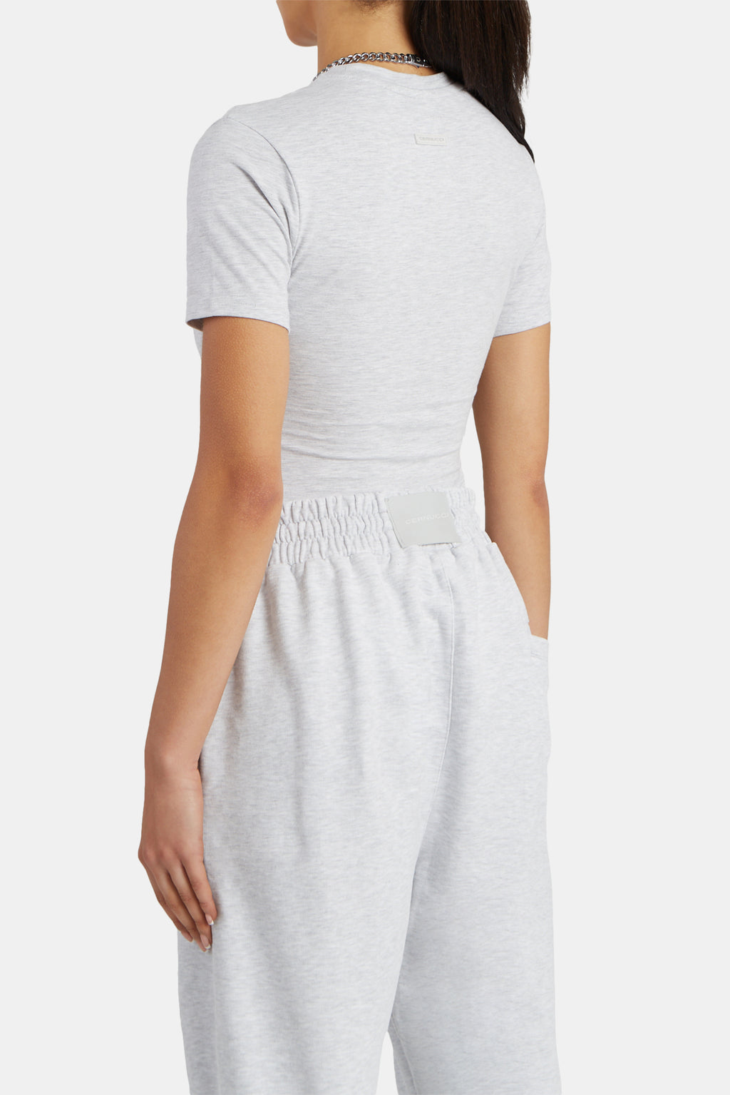 Hellgrau meliertes, kurzärmliges, tailliertes Oberteil aus weichem , elastischem Baumwolljersey mit farblich passendem Gummiabzeichen im Nacken.