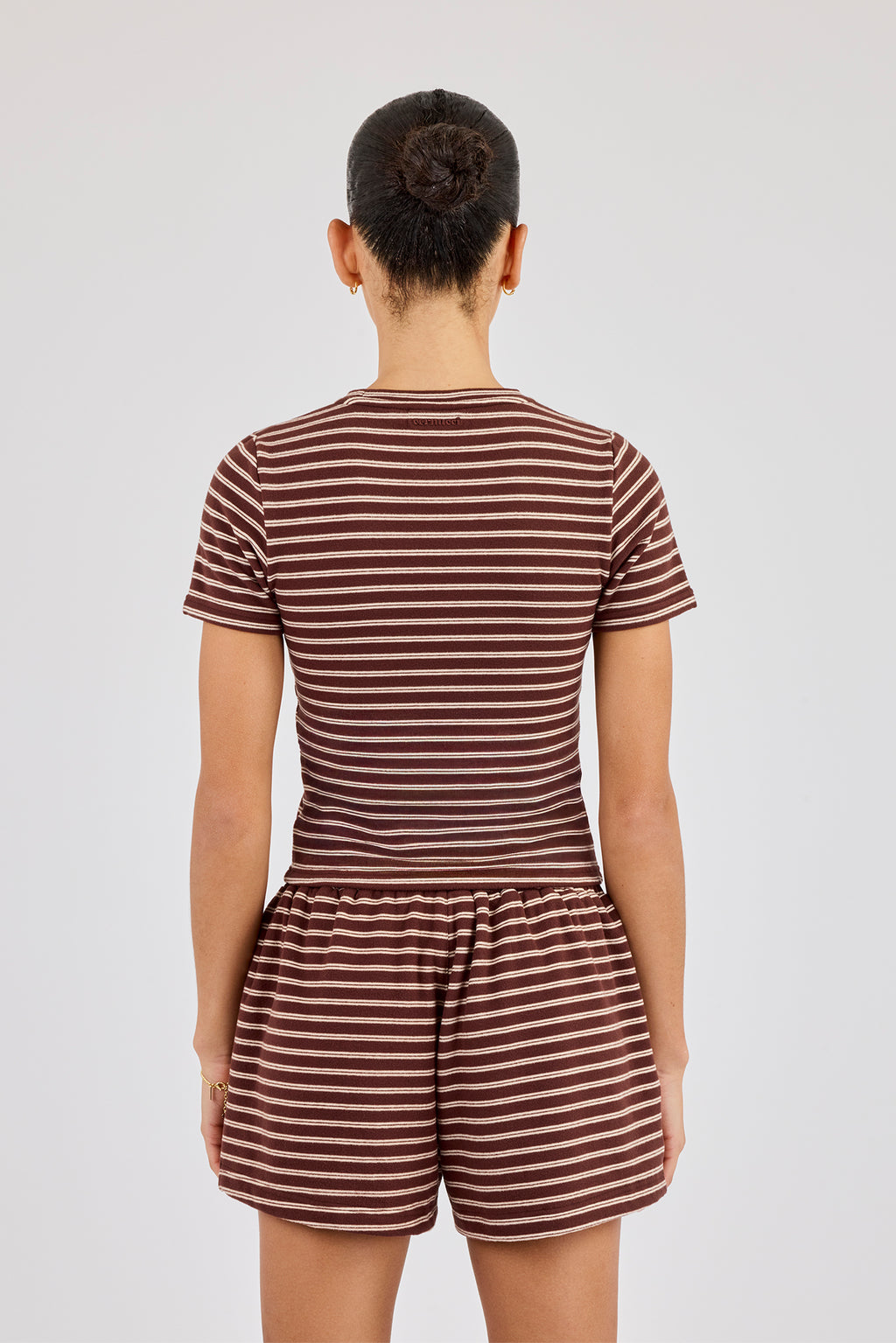 Weiches, kurzärmeliges Streifenshirt mit gesticktem Logo im Nacken. Kombinieren Sie es mit der passenden, weichen Shorts für den perfekten Look.