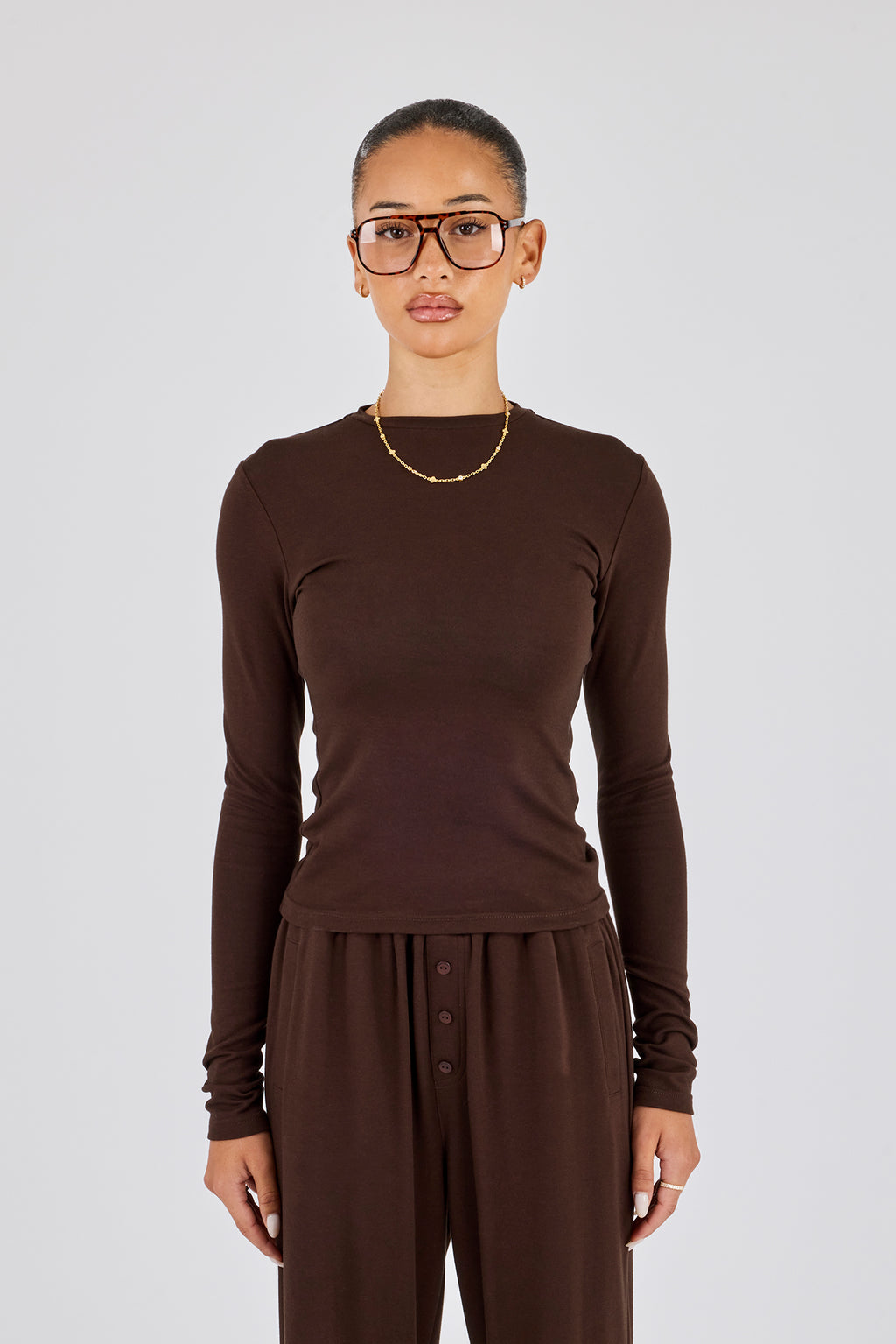 Weiches Langarmshirt in dunkler Schokolade mit aufgesticktem Logo im Nacken. Kombinieren Sie es mit dem passenden Soft-Touch-Top und vervollständigen Sie den Look.