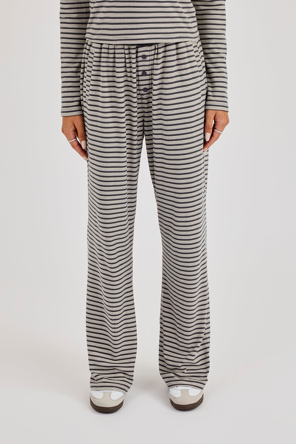 Gestreifte Hose mit weichem Griff und Knopfdetails. Kombinieren Sie sie mit dem passenden Oberteil aus weichem Griff für den perfekten Look.