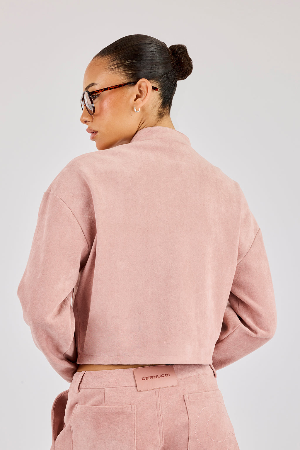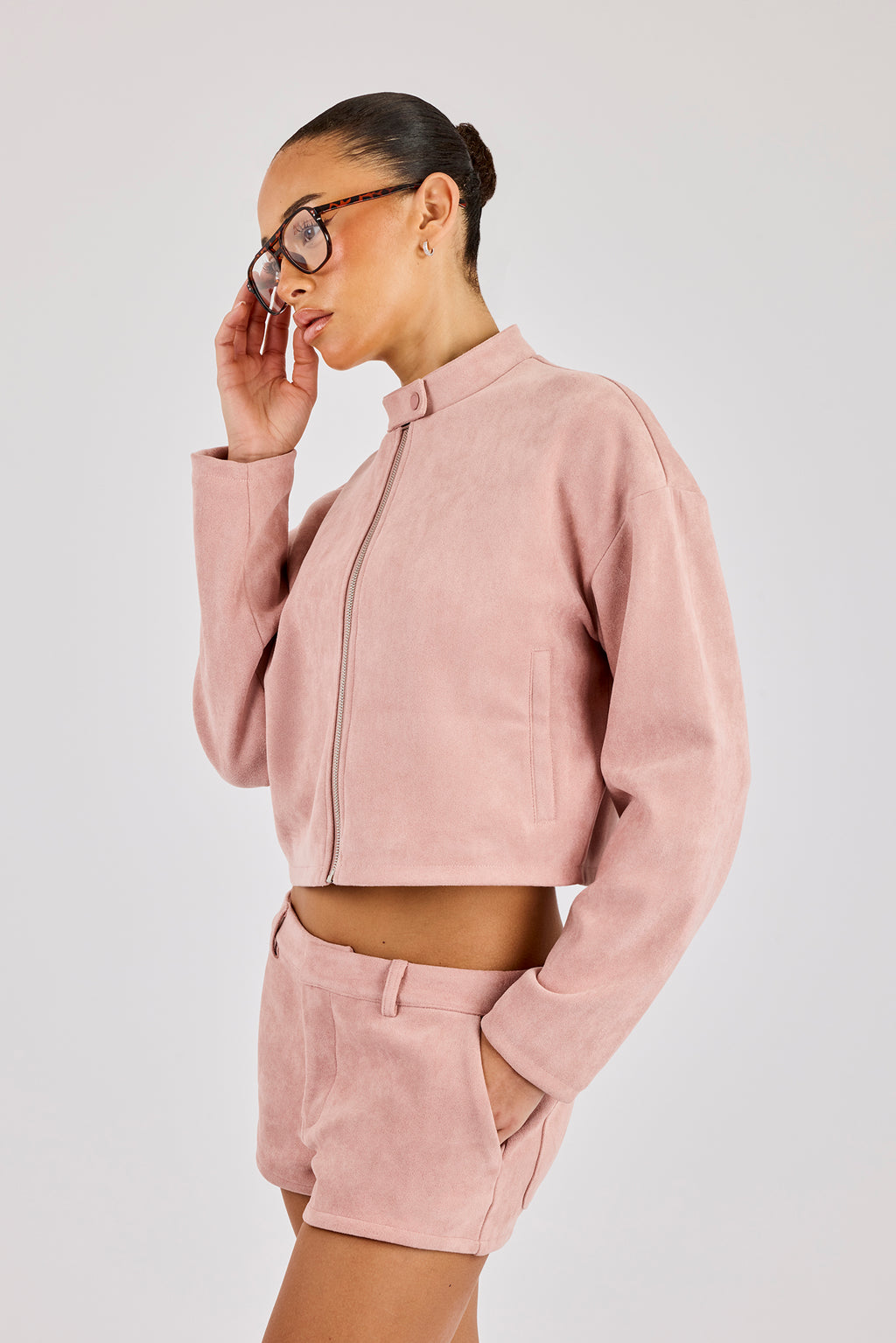 Altrosa Bikerjacke mit durchgehendem Reißverschluss. Hochwertiges, weiches Wildleder mit Markendetails.
