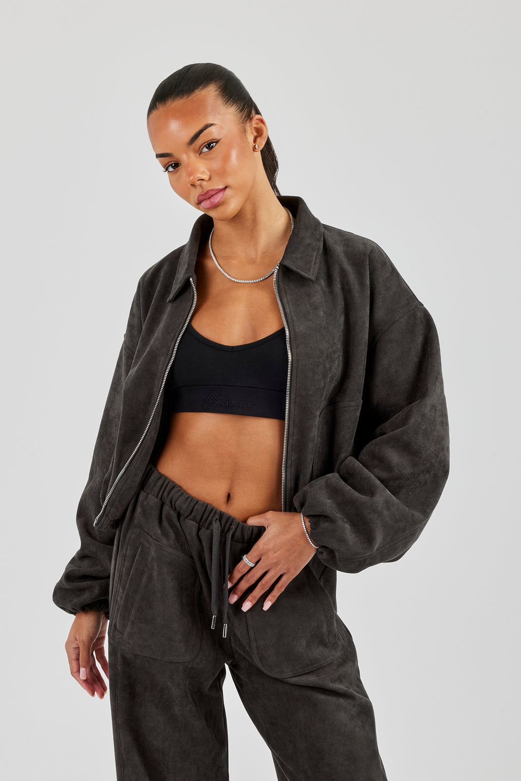 Anthrazitfarbene Bomberjacke mit durchgehendem Reißverschluss und Kragen. Hochwertiges, weiches Wildleder mit Markendetails.