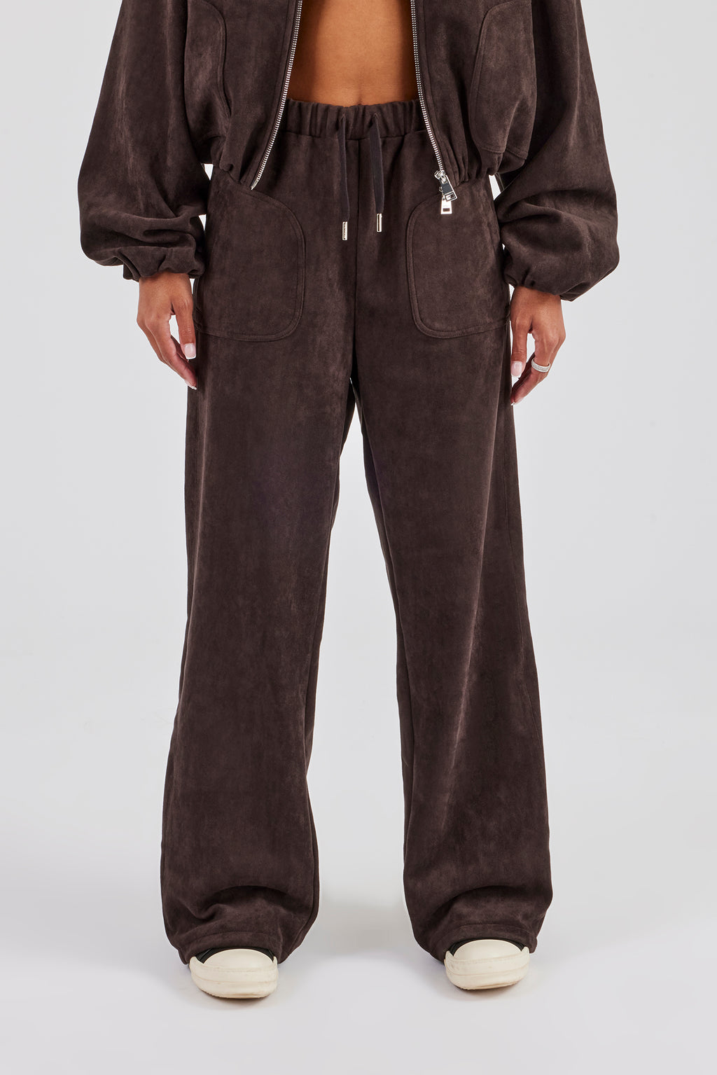 Schokoladenbraune Hose mit weitem Bein. Hochwertiges, weiches Wildleder mit Taschendetail und Markenbesatz.