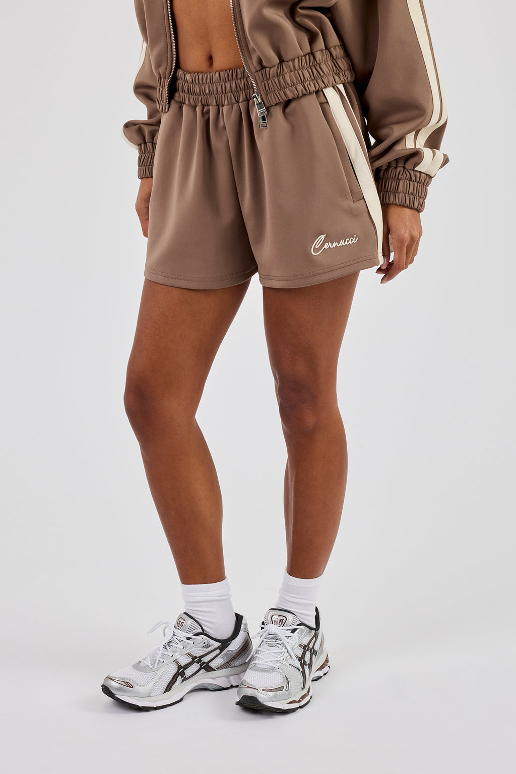 Shorts aus weichem Scuba mit taupefarbenem Streifenmuster und kontrastierendem Seitenteil.
