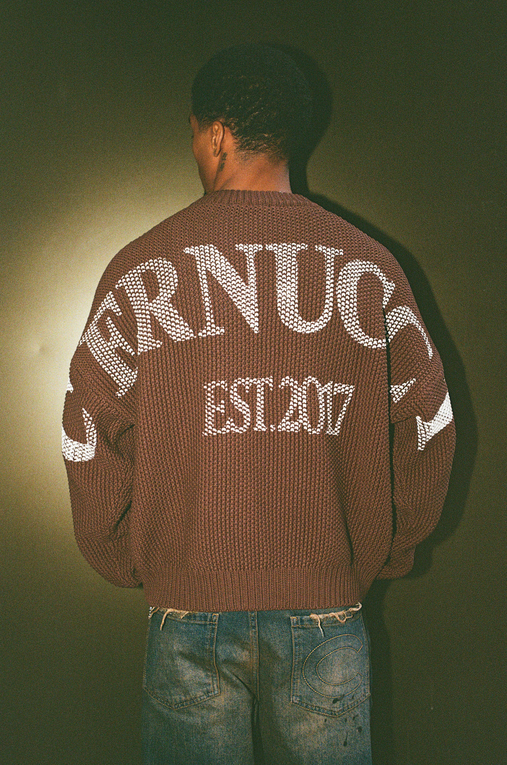 Schokoladenbraunes strukturiertes Strick-Sweatshirt mit aufgedrucktem Markendetail.