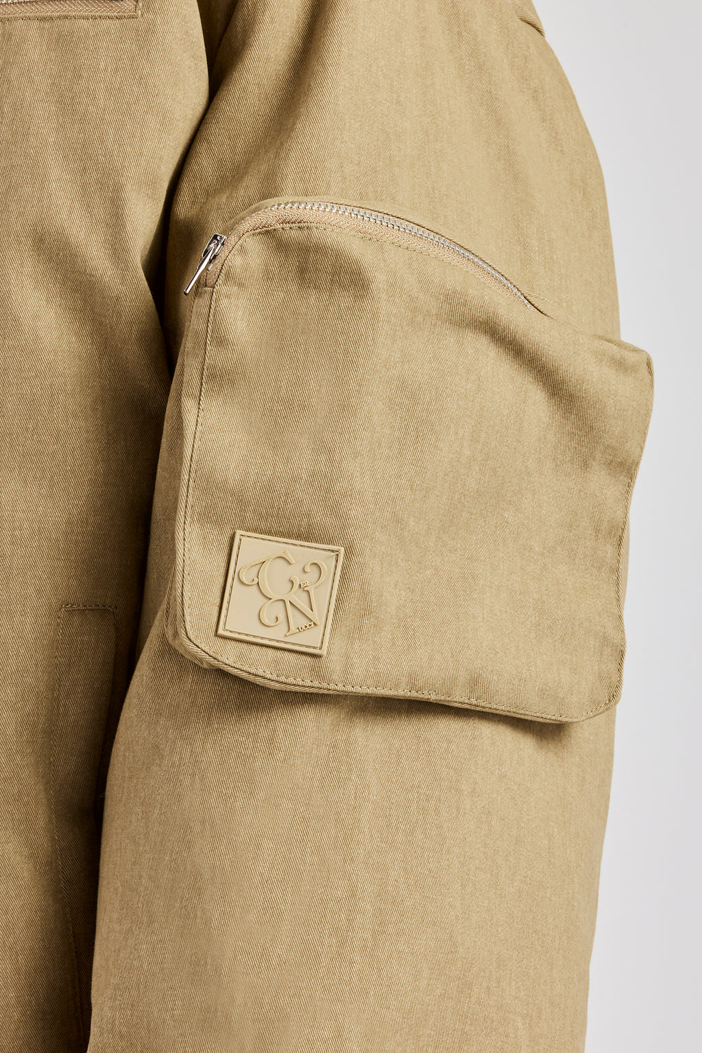 Taupefarbene, wattierte Bomberjacke mit praktischen Cargotaschen und farblich abgestimmtem Branding. Übergroße Passform aus schwerem, weichem Twillstoff.