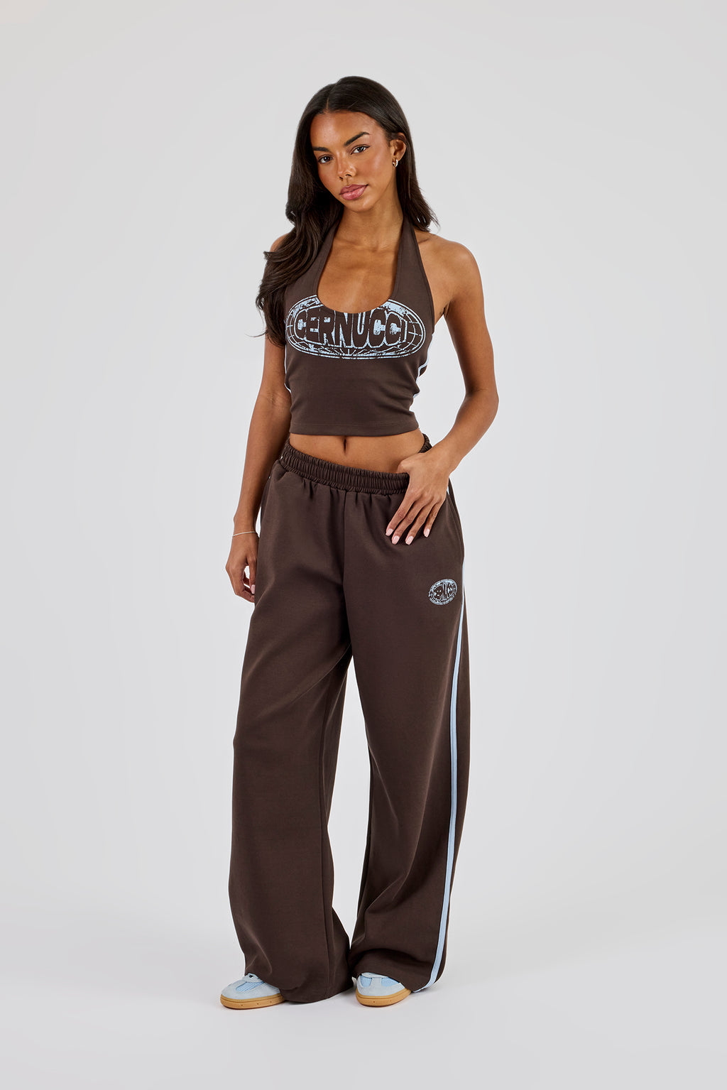Dunkelbraunes Halterneck-Top mit aufgedrucktem Cernucci-Logo. Kombiniere es mit unserer passenden Jogginghose, um den Look zu vervollständigen.
