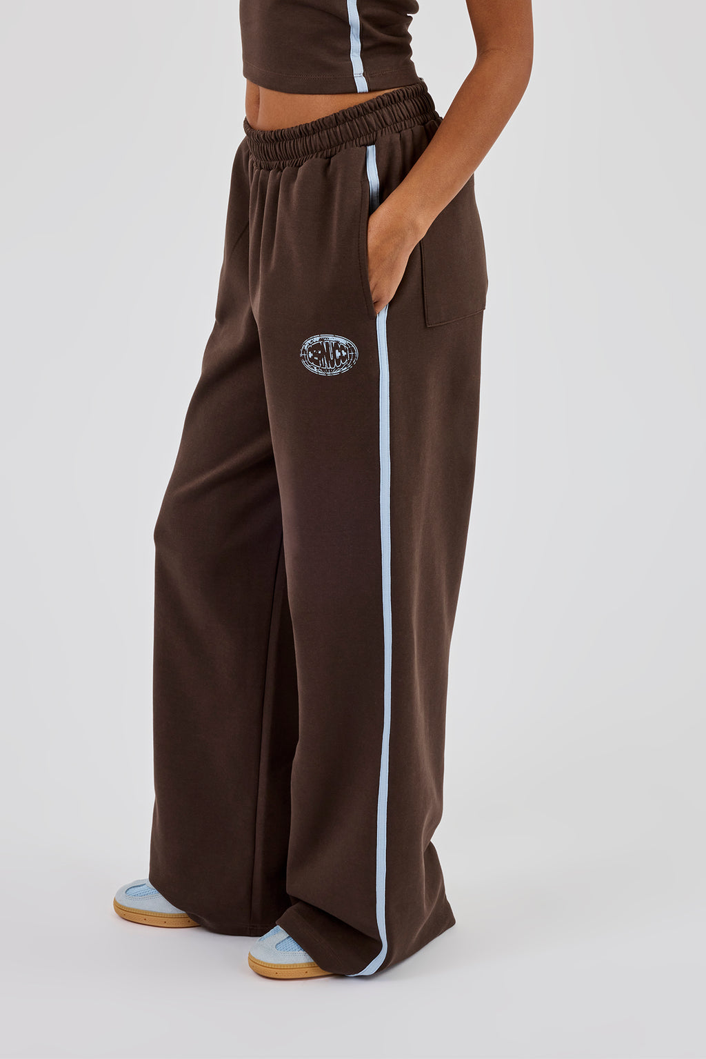 Ausgefranster Halterneck-Crop-Top mit Logo und weite Jogginghose mit Print – Dunkelbraun