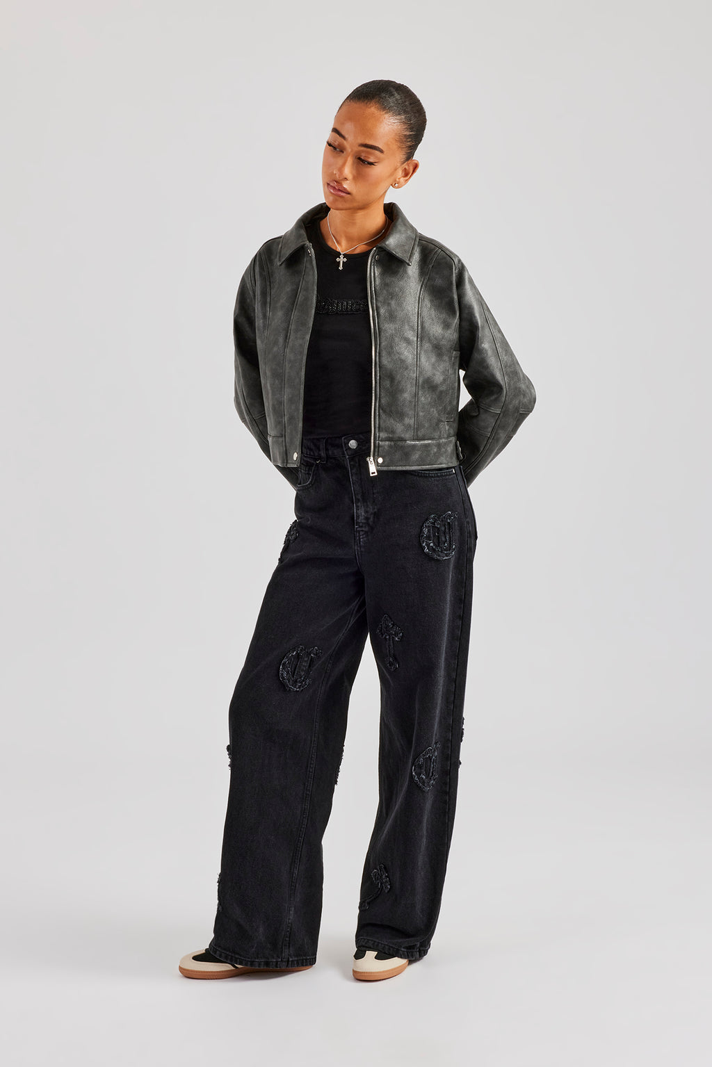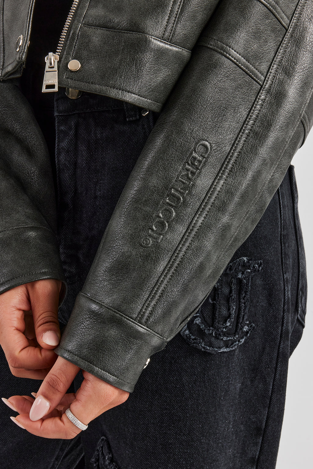 Verwaschene, anthrazitfarbene PU-Jacke mit geprägtem Logo am Ärmel. Übergroße, kastige Passform aus schwerem PU. Kombinieren Sie sie mit unserem passenden PU-Minirock für den kompletten Look.