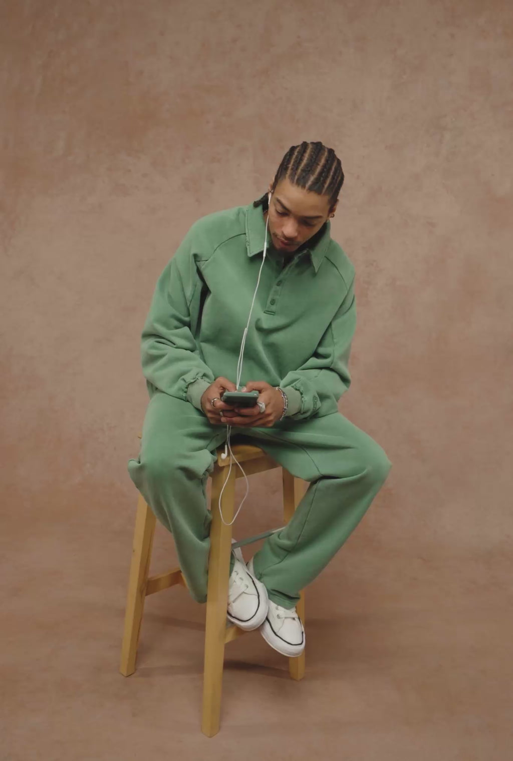 Verwaschene grüne Jogginghose mit geradem Bein aus mittelschwerer, weicher Baumwolle.
