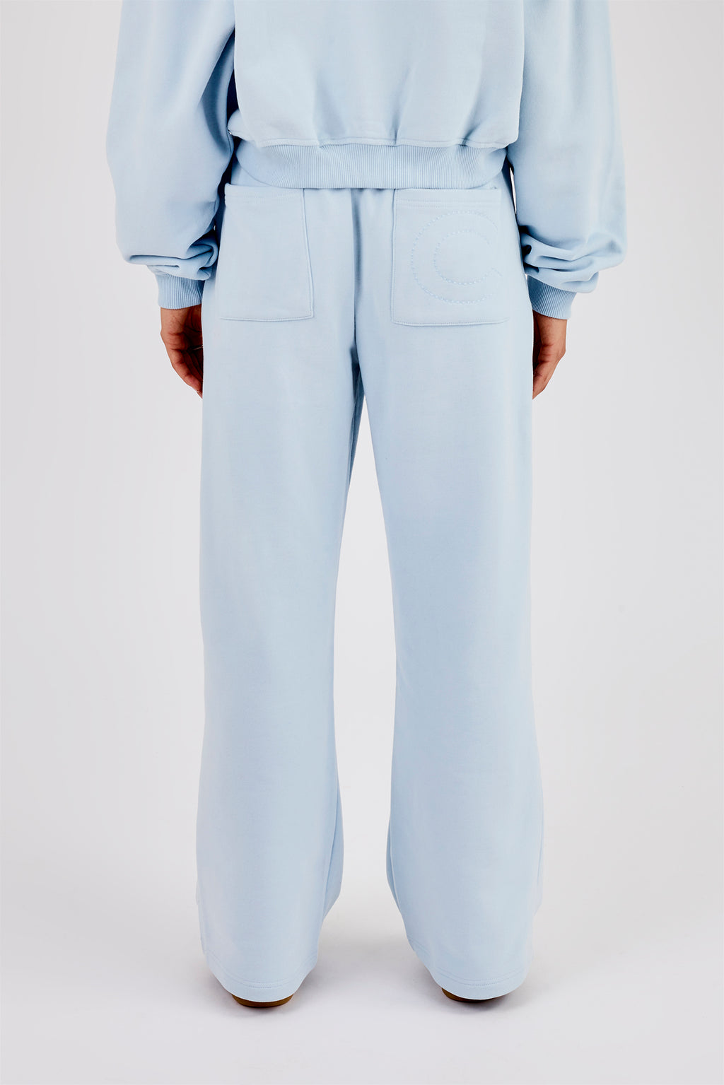 Hellblaue Jogginghose mit weitem Bein. Hochwertiger, weicher Jersey mit Cernucci-Logo-Aufnäher aus PU mittig am hinteren Bund.