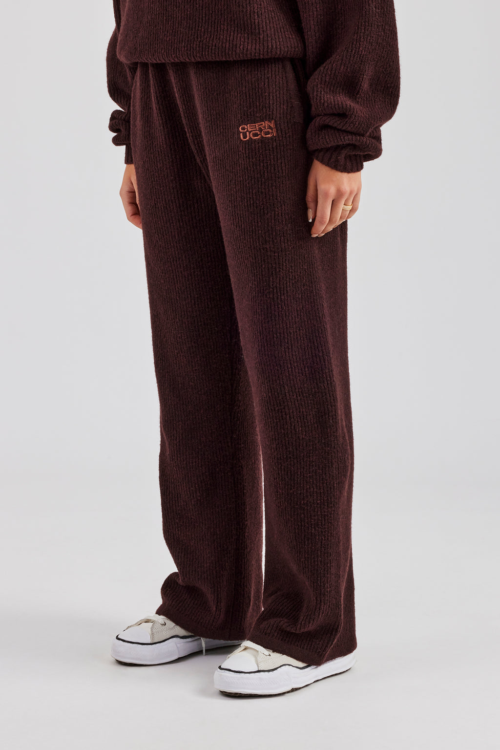Schokoladenbraune Jogginghose mit weitem Bein aus weichem Strick mit farblich abgestimmter Stickerei.