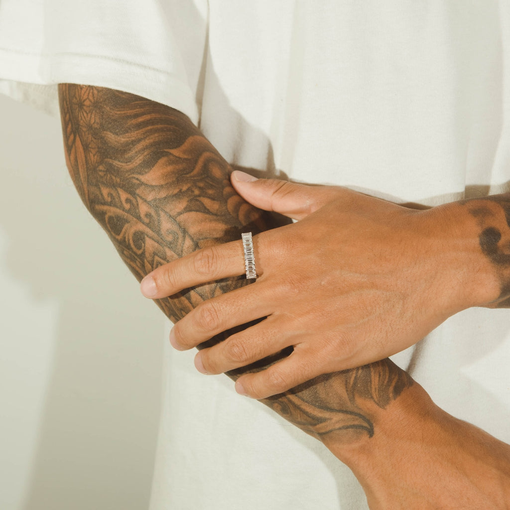 Our Baguette Ring is the perfect trend-setting piece. The 3mm baguette cut stones around the band shine hard and demand attention. Built with 925 Sterling Silver and White.