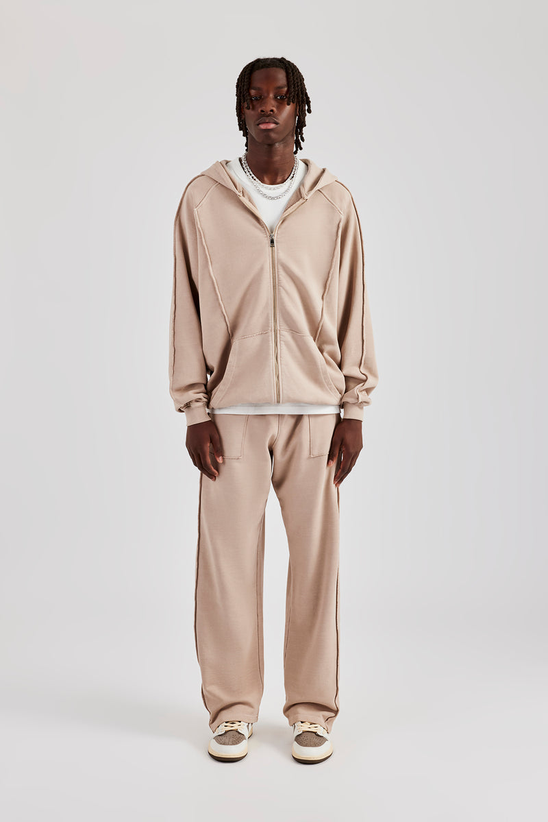 Stone acid wash straight leg jogger with raw edge detail. Premium heavyweight soft touch jersey.